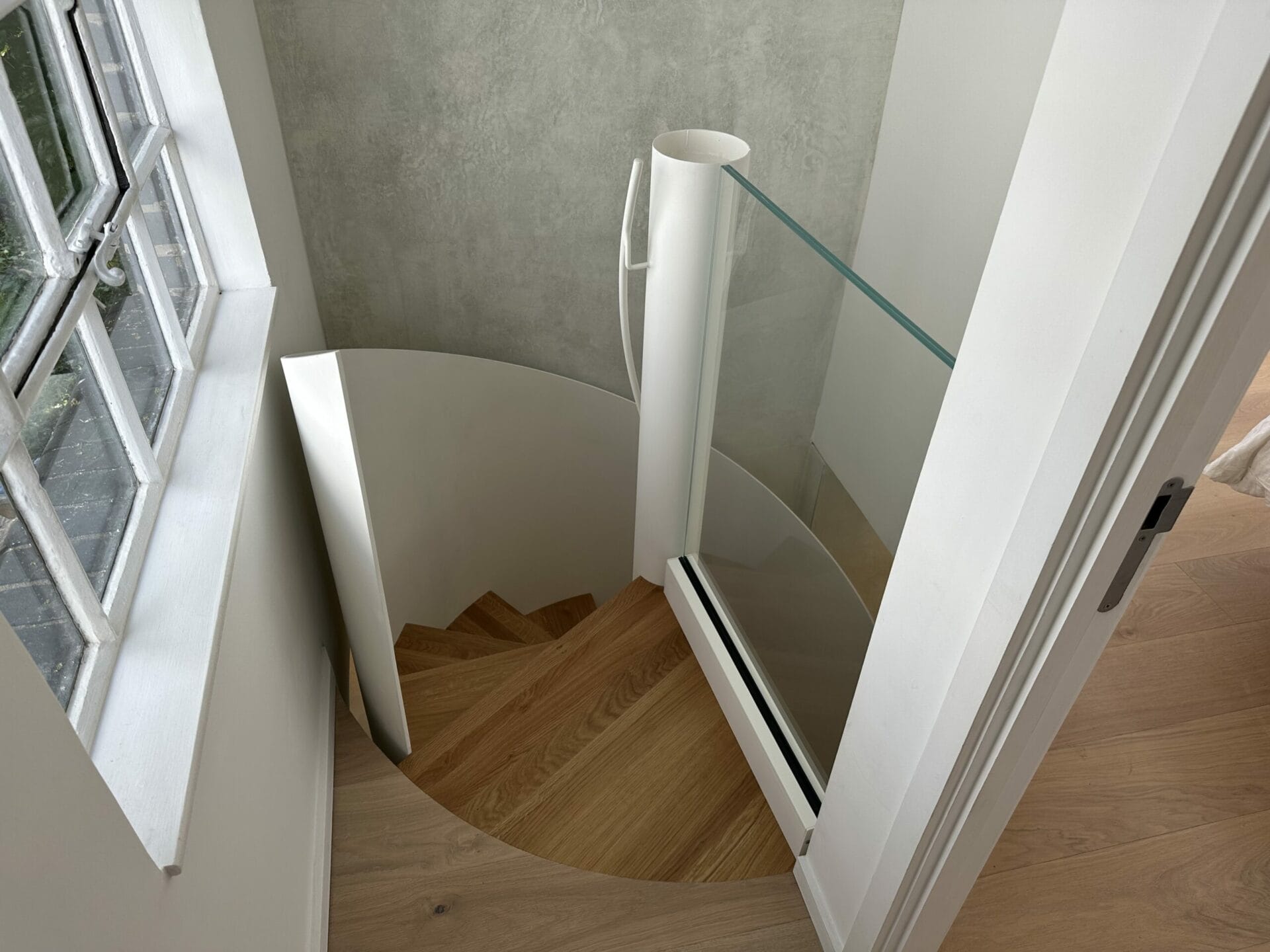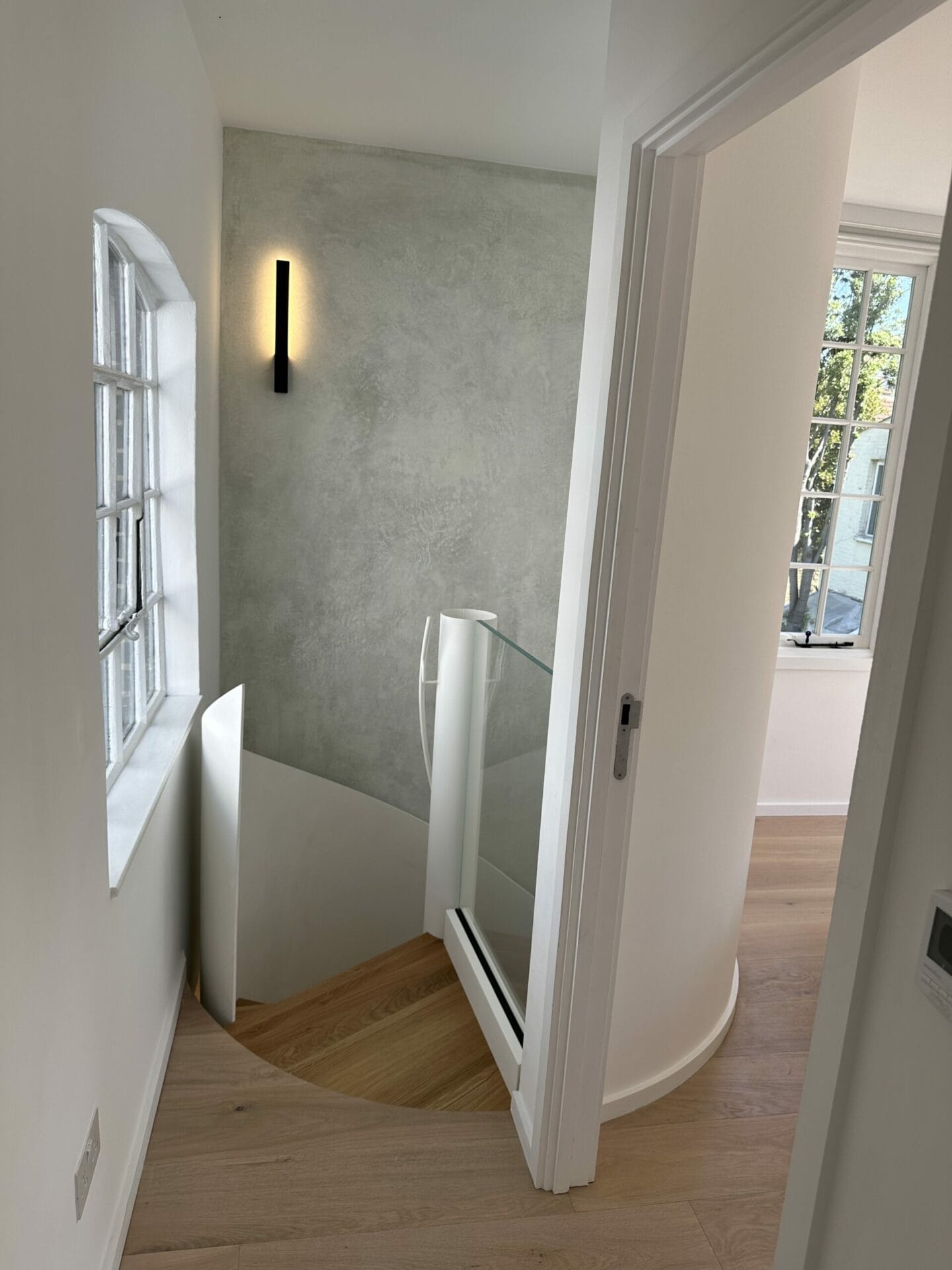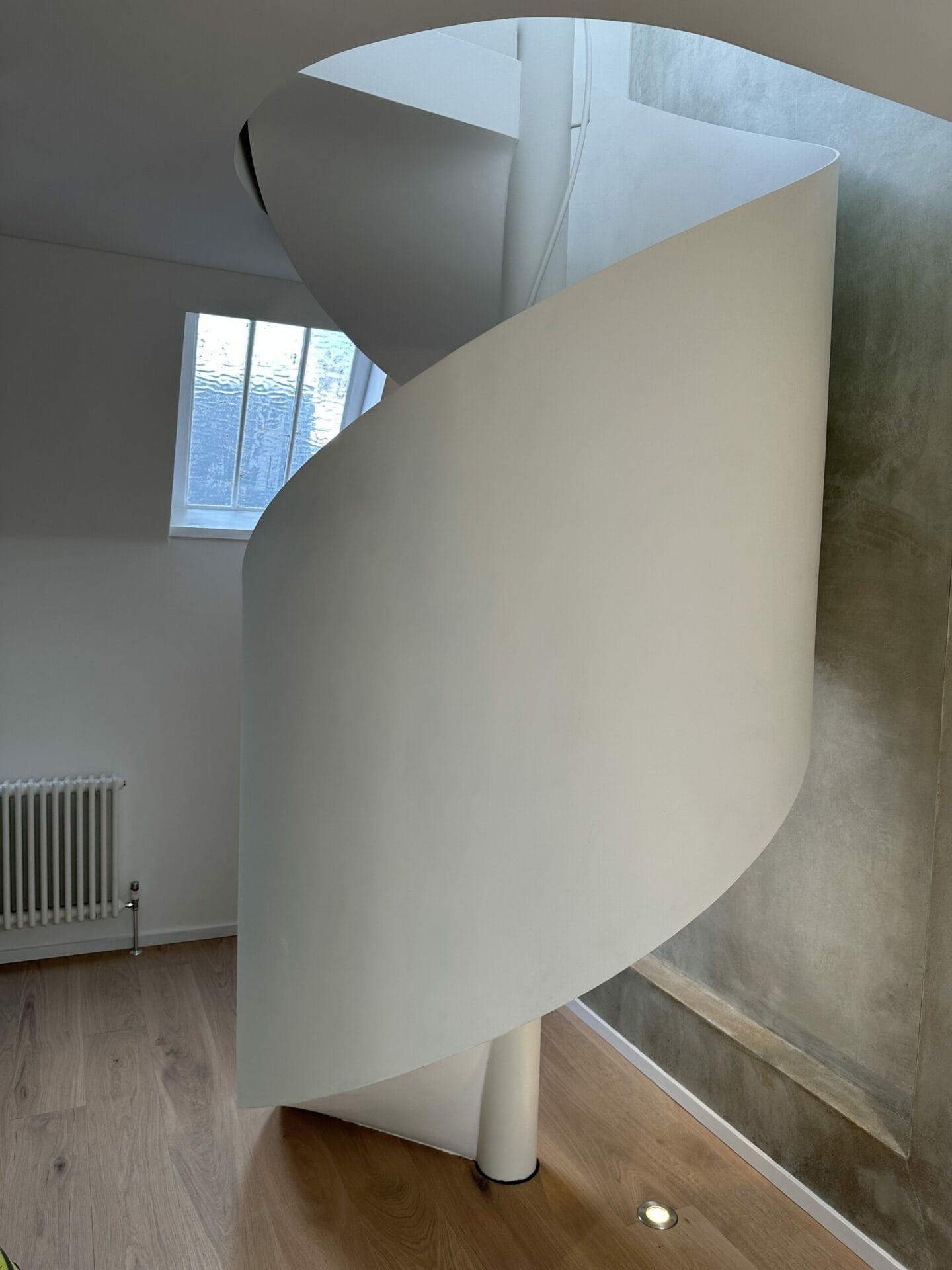 Handrail and Balustrade: The white metal string that winds along the staircase acts as both a balustrade and a handrail. Its design and height conform to the guidelines provided by the Building Regulations, ensuring user safety without compromising the aesthetic appeal.