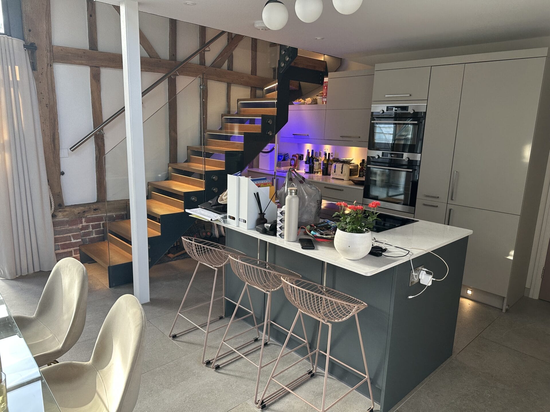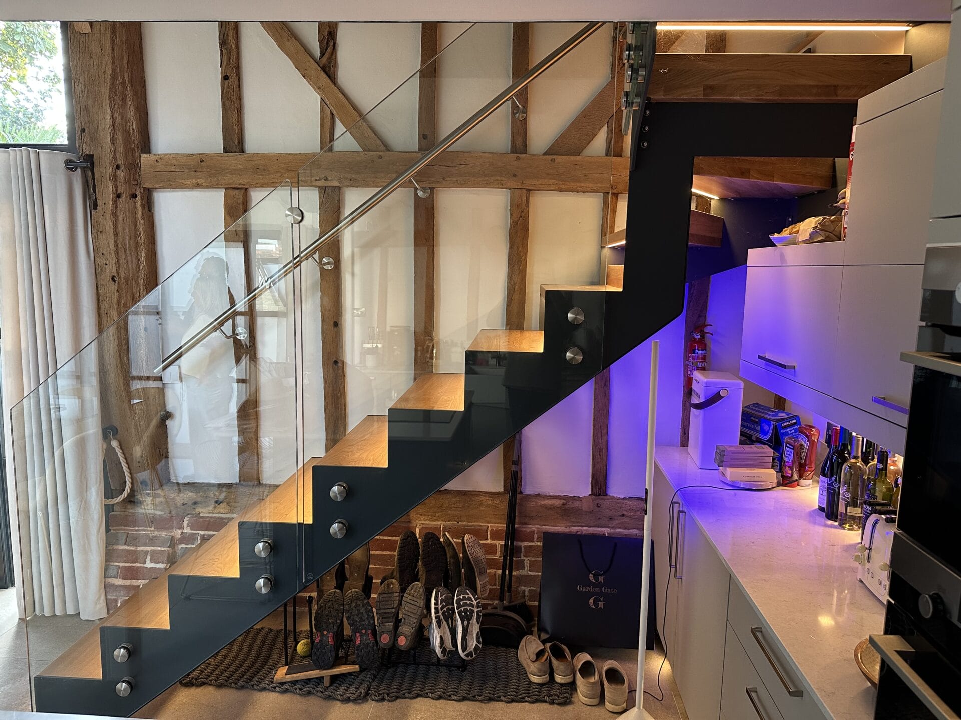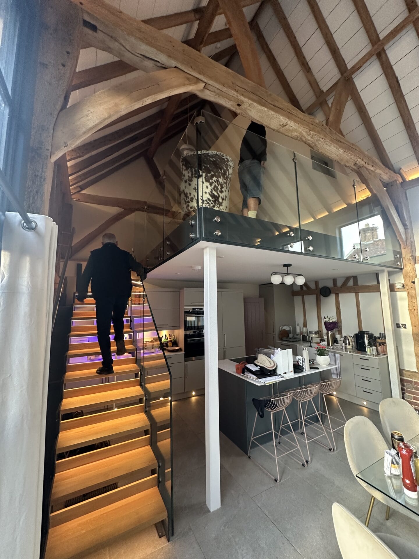 Set beneath impressive exposed original oak beams and over stunning stone flooring, the staircase acts as both a practical circulation feature and a bold architectural focal point. Its clean, minimalist lines contrast beautifully with the barn’s rustic textures, creating a seamless blend of heritage and modern design. Every detail was carefully considered to comply with the restrictions of the Grade II listing, ensuring that the installation respected the building’s historic fabric while delivering a truly contemporary staircase solution.