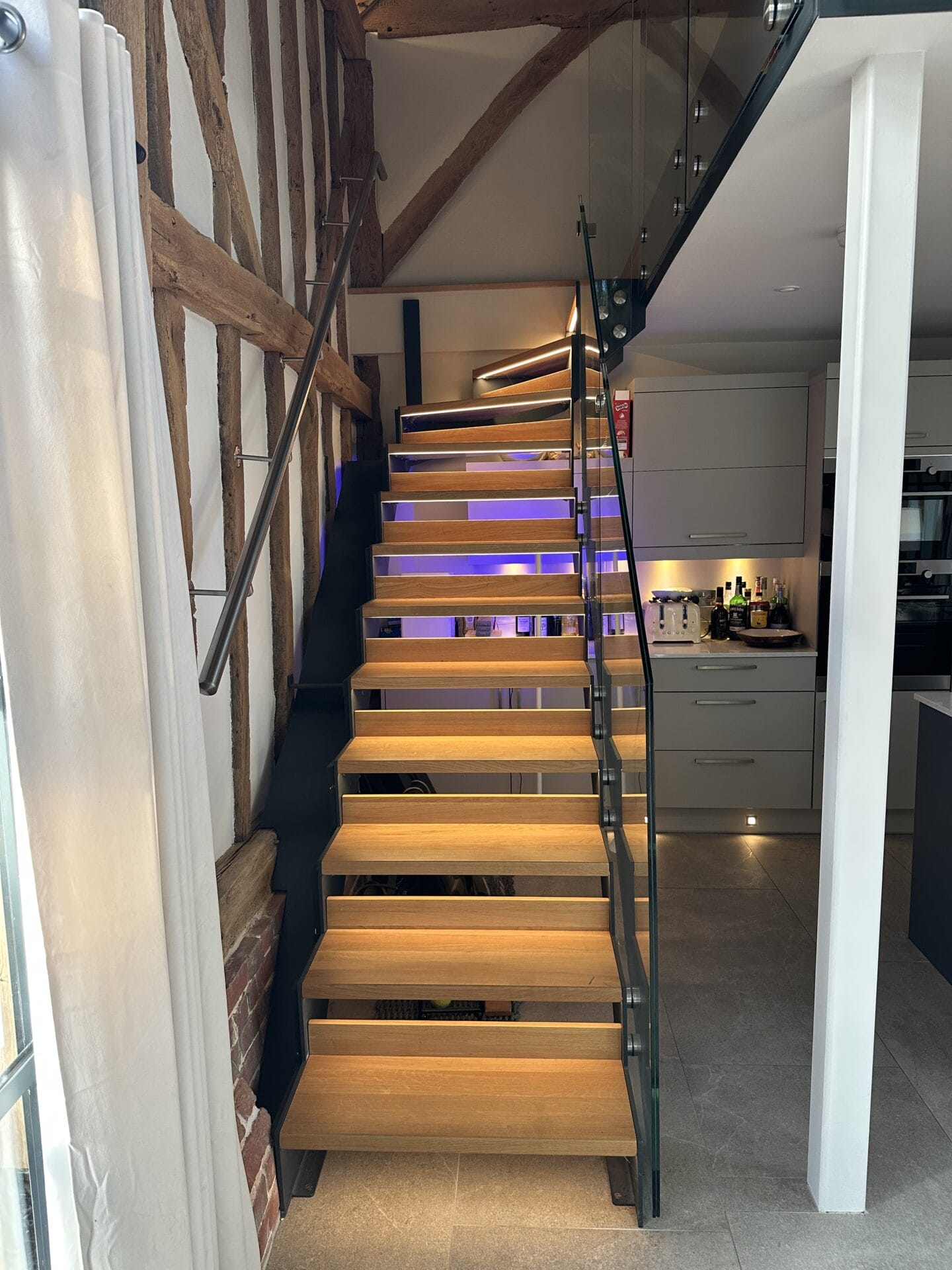 This bespoke oak and metal staircase with integrated LED lighting was designed and installed for a stunning Grade II listed barn conversion in West Sussex, where contemporary craftsmanship needed to sit comfortably alongside historic character.