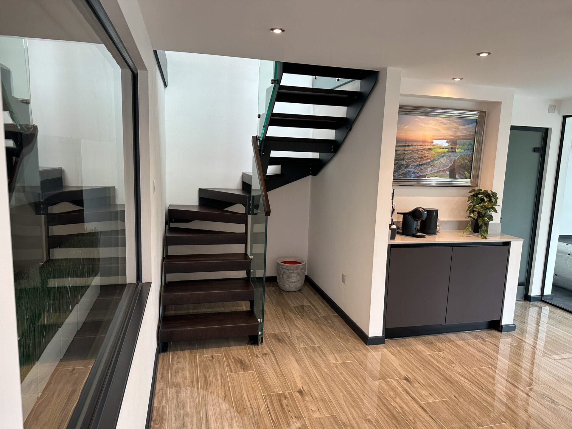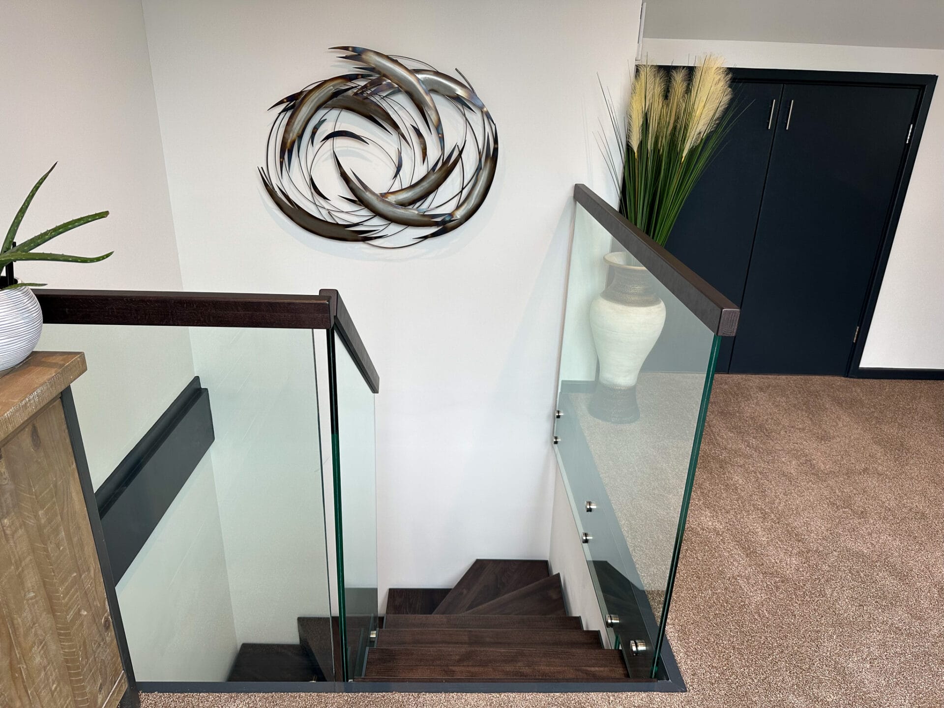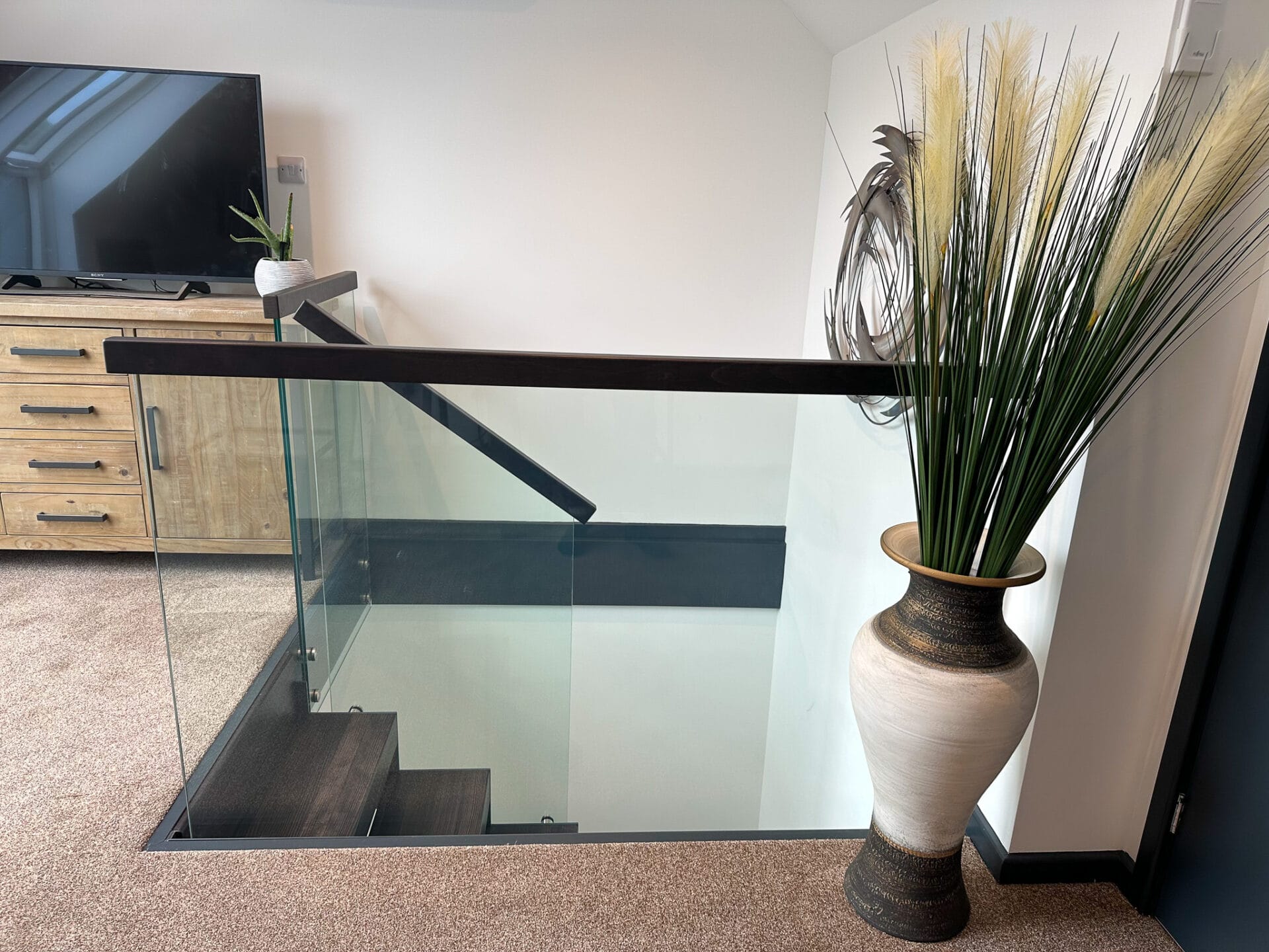 Continuing the captivating design, the landing balustrade has been meticulously designed to match the staircase, complete with anthracite grey aprons. This cohesive design approach ensures a unified and visually cohesive look throughout the entire staircase system. The anthracite grey aprons add a touch of sophistication, further accentuating the sleek and modern appeal of the staircase.
