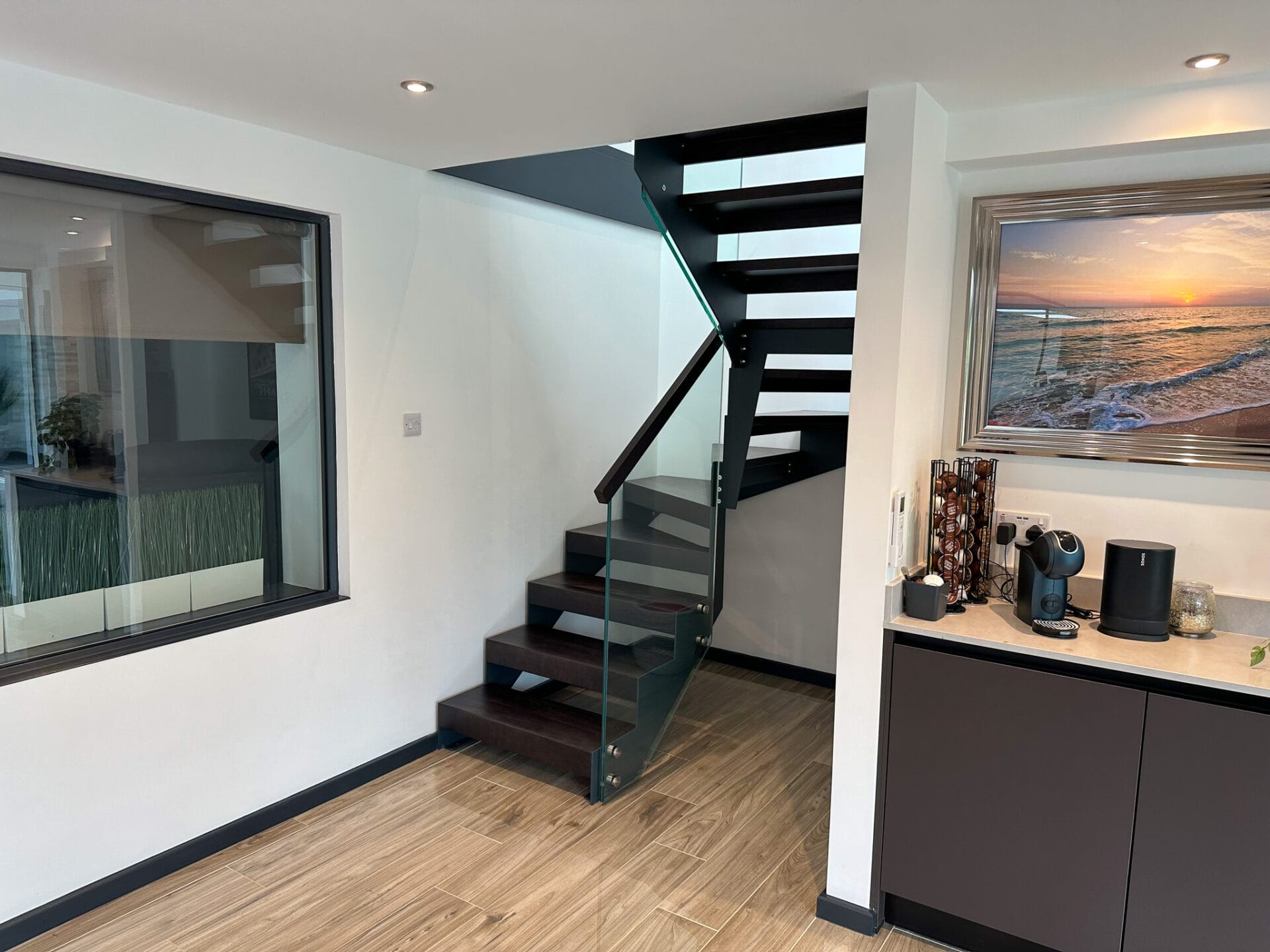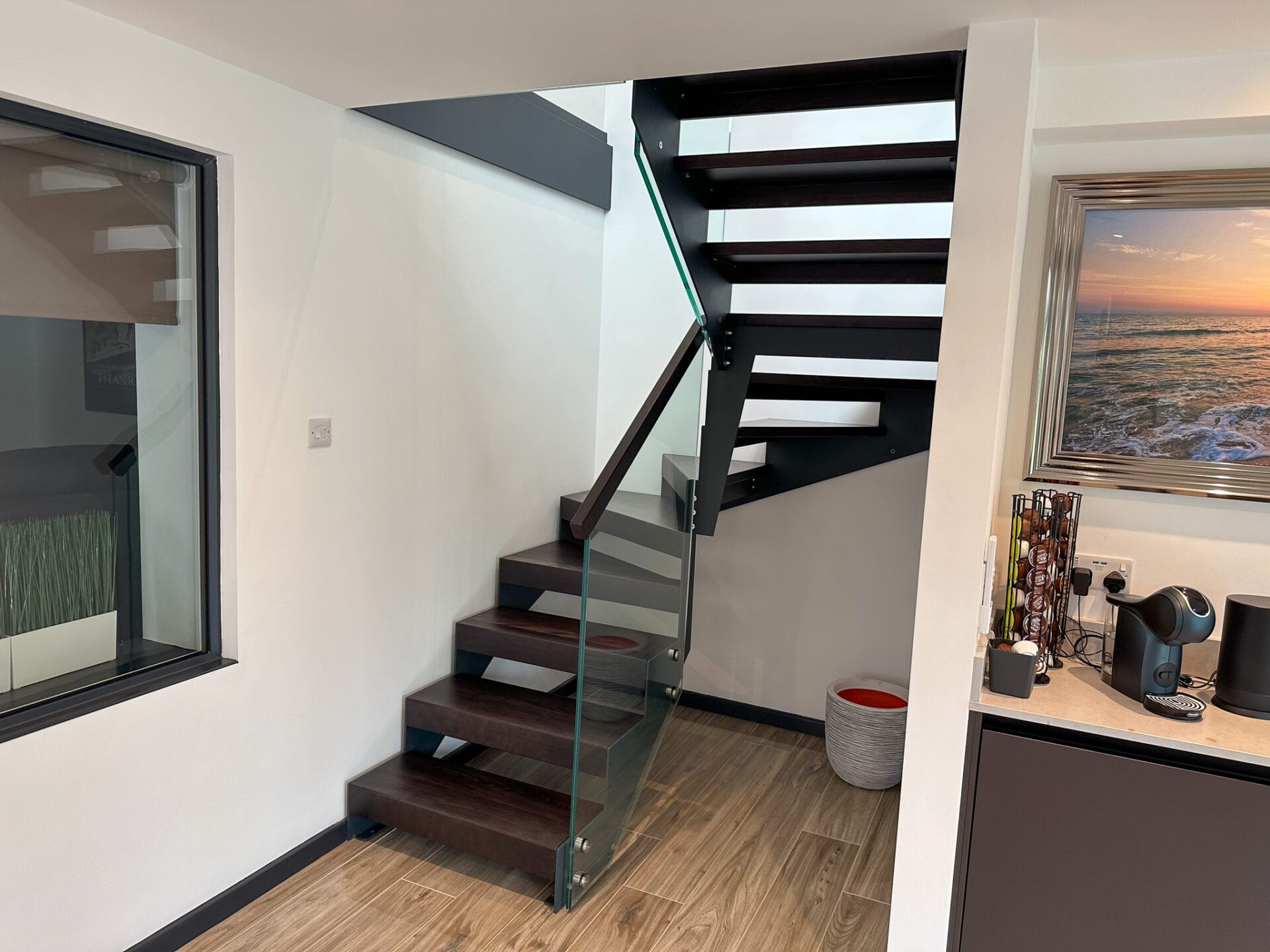 Whether you are an architect, interior designer, or homeowner looking to make a bold statement, this metal staircase with anthracite strings and walnut-stained oak treads is sure to leave a lasting impression. Its combination of innovative design, meticulous craftsmanship, and adherence to UK Building regulations makes it an exceptional choice for those seeking a unique and visually captivating staircase solution.