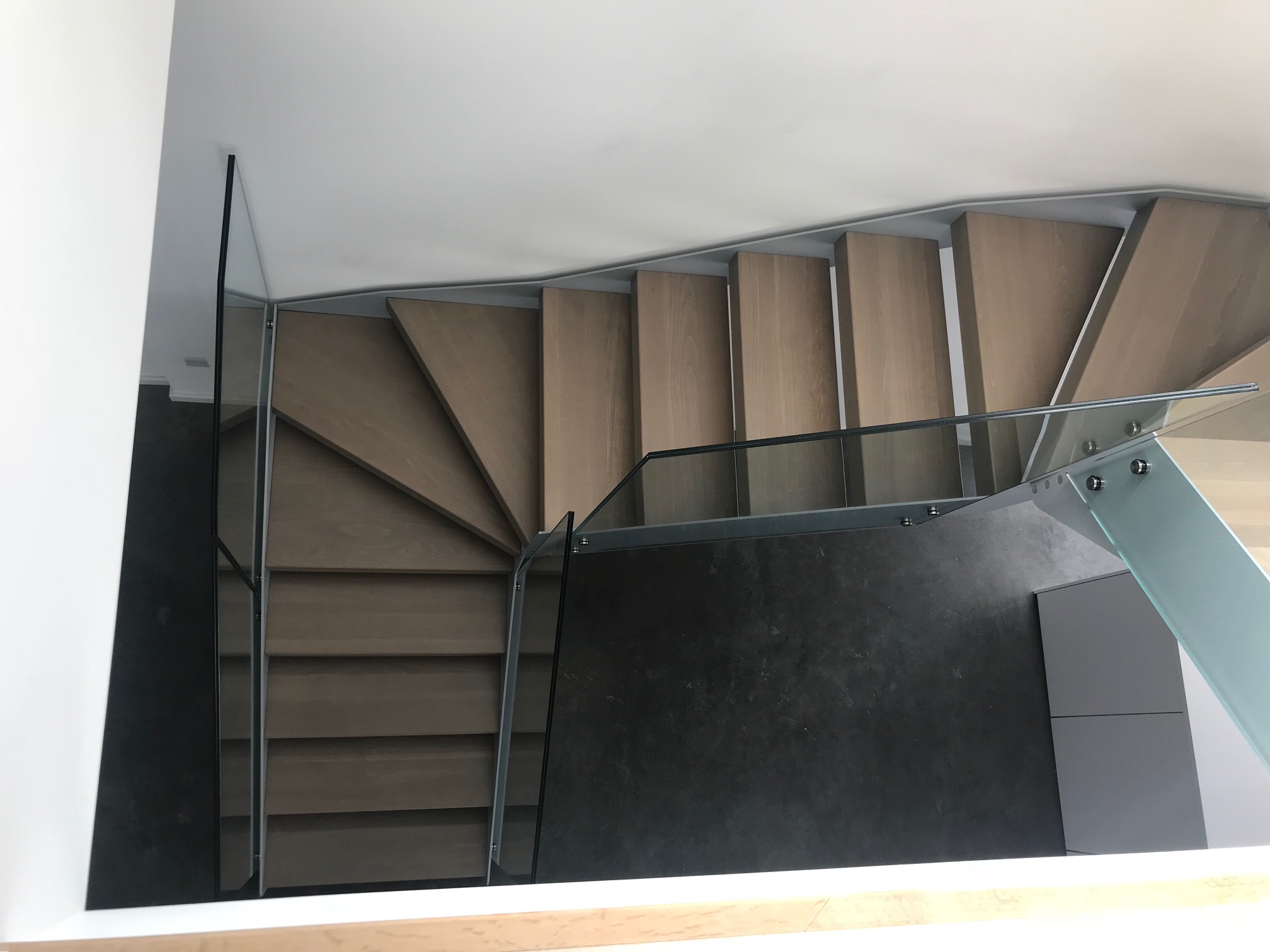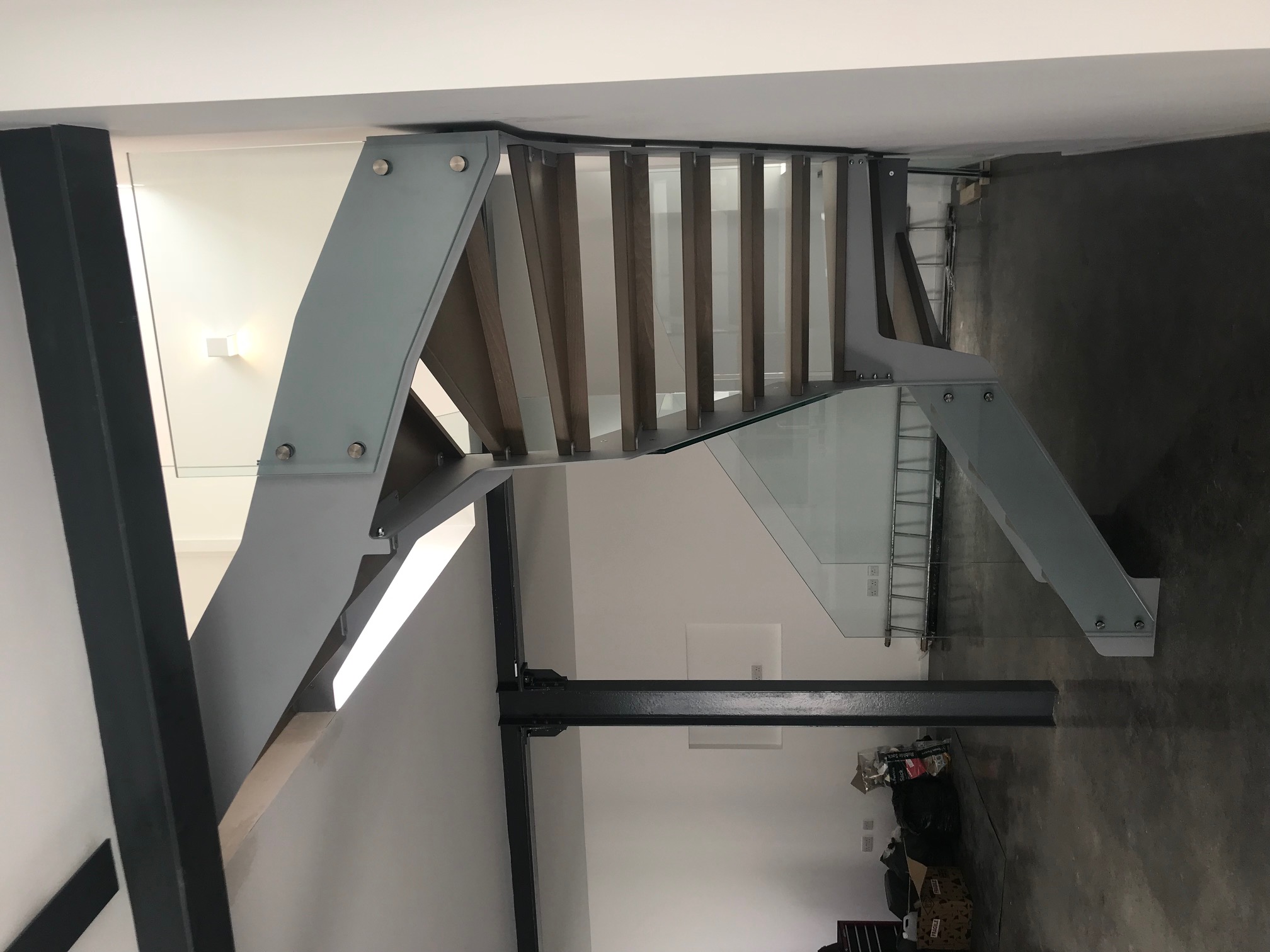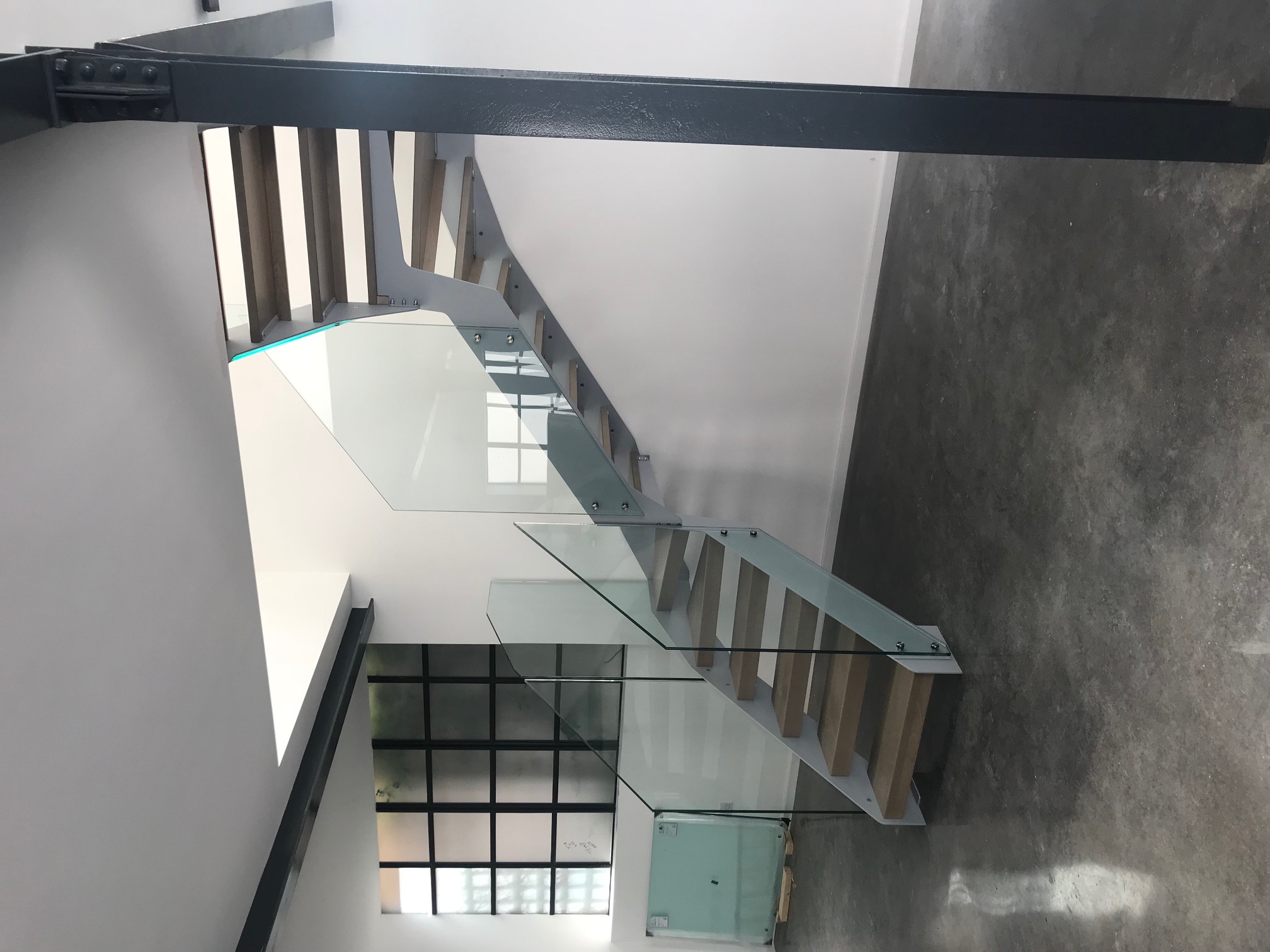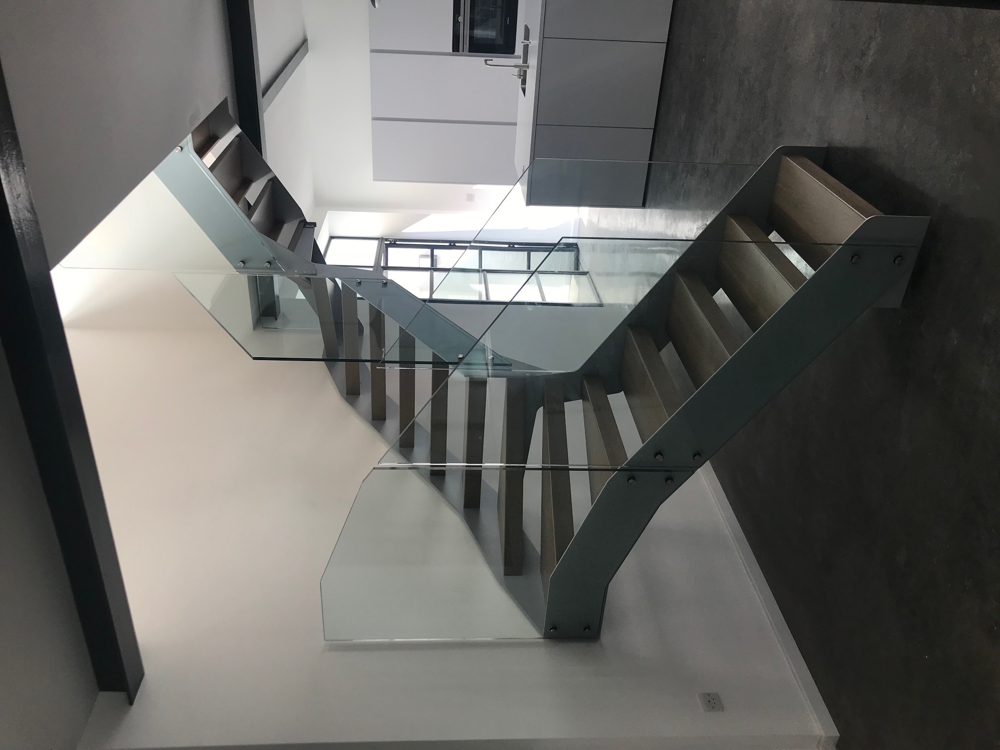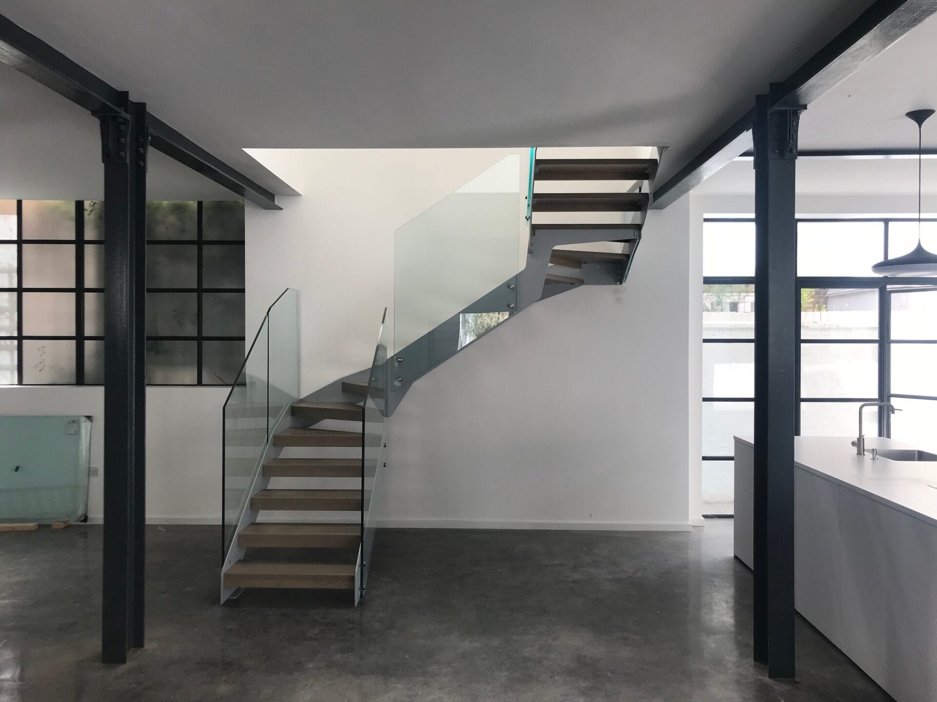 Open plan living concept. Staircase in Ral 9006 (Silver) L shaped treads to reduce gap between steps to <100mm for building regulations. Frameless glass balustrade finishes the 'light' feel of the staircase.