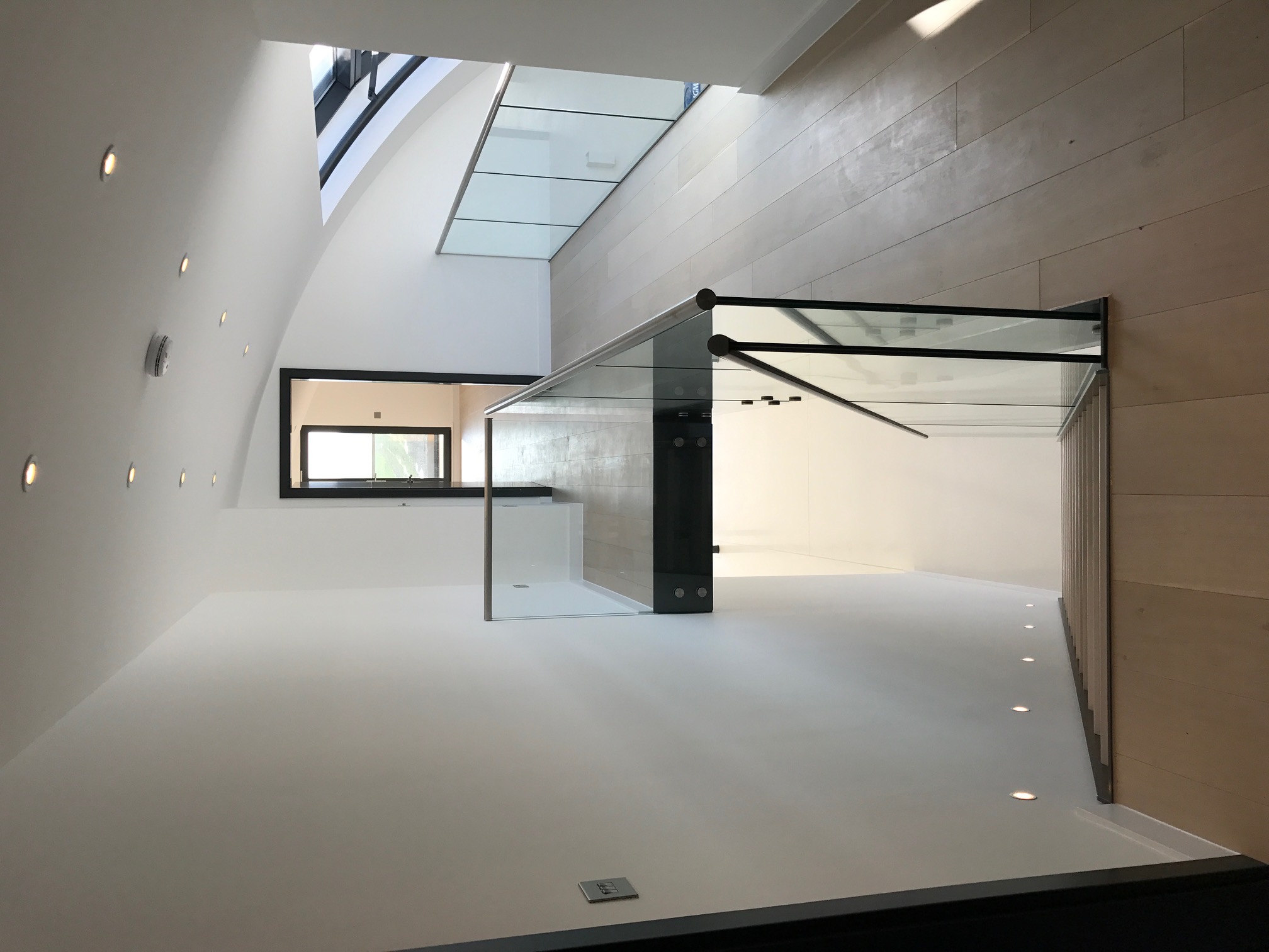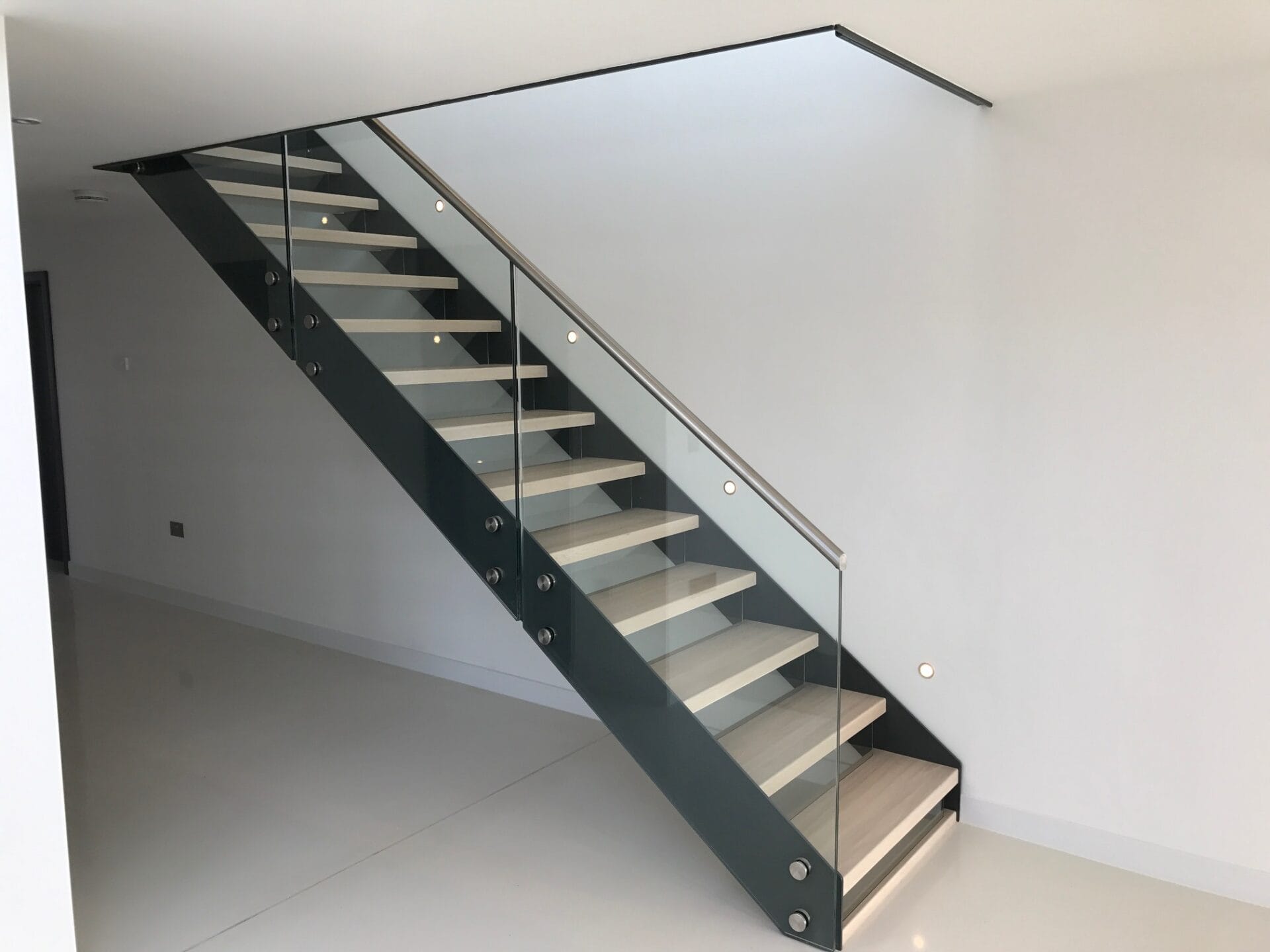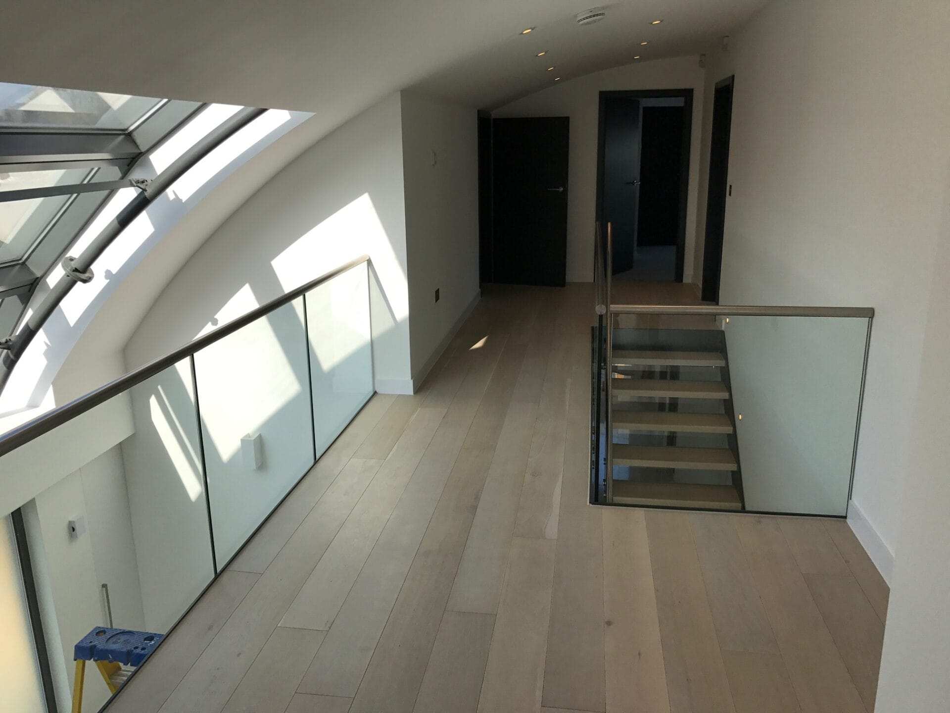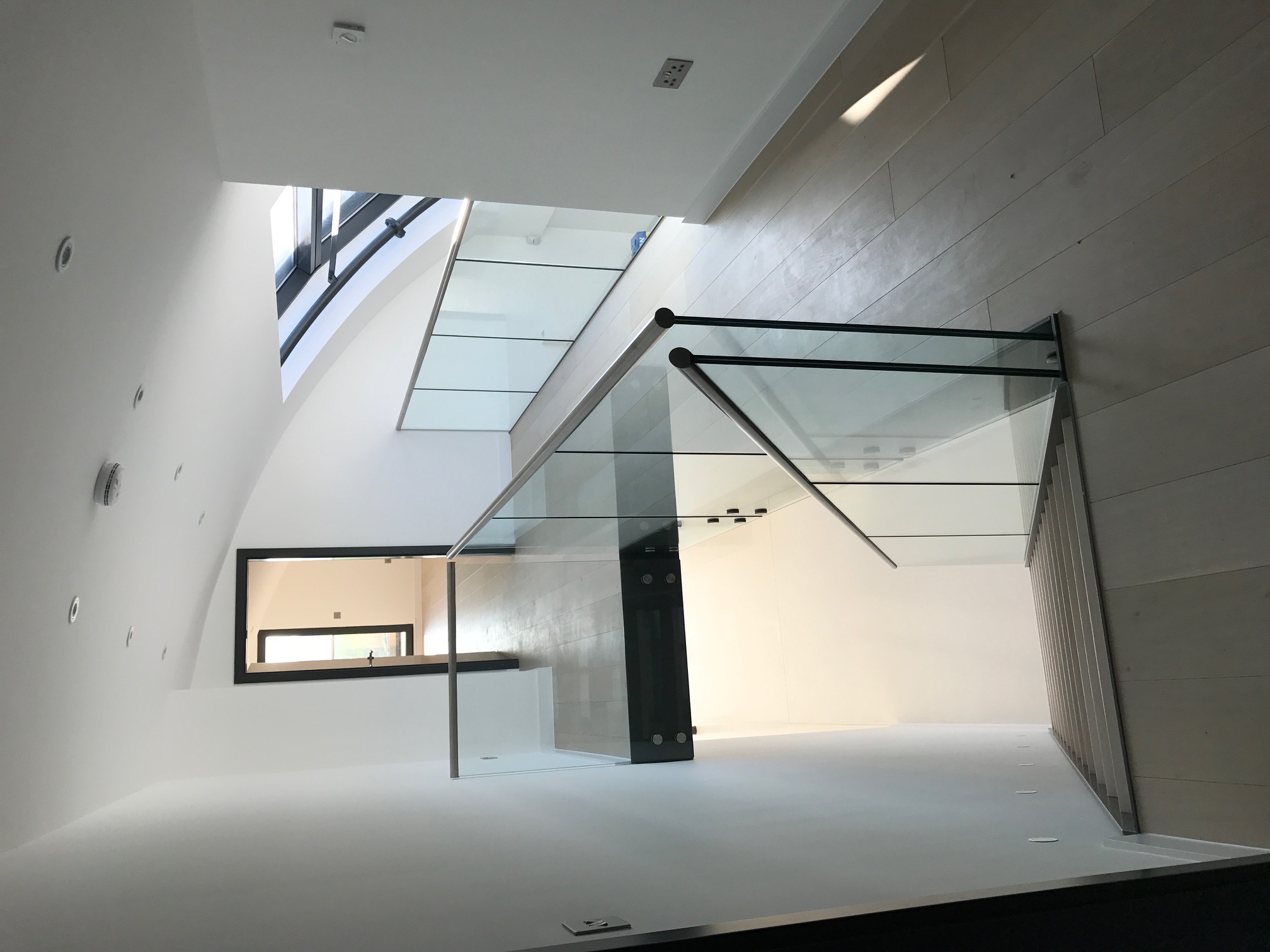 Staircase treads colour matched to flooring. Aprons lined with steel to match staircase and to provide additional strength. Frameless Glass, toughened and laminated to staircase and landings.