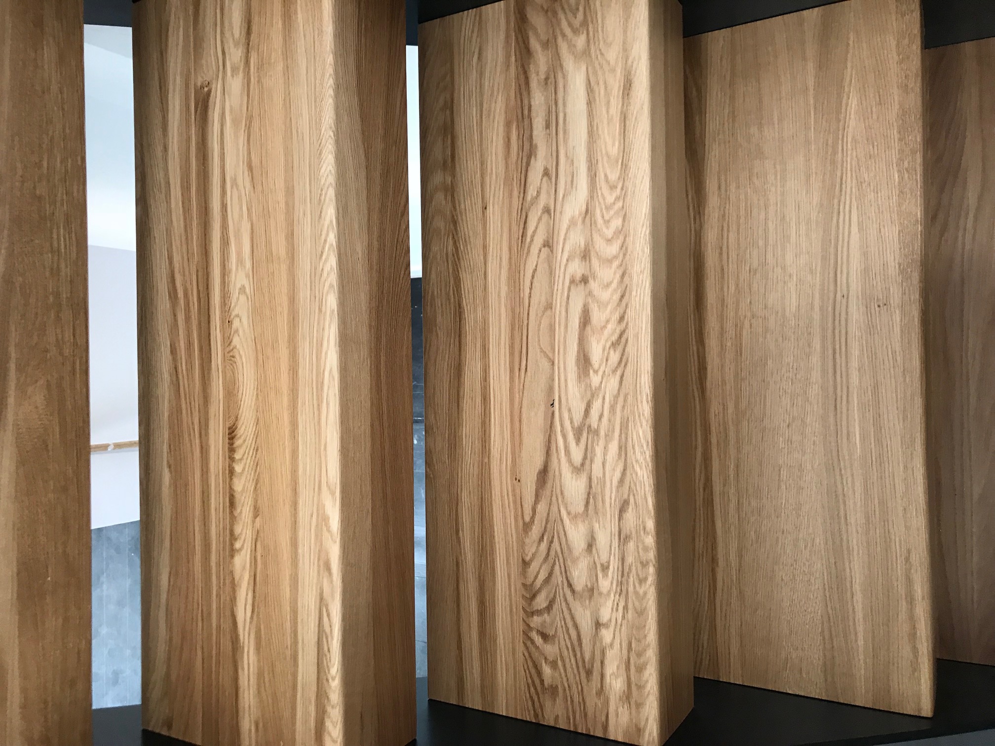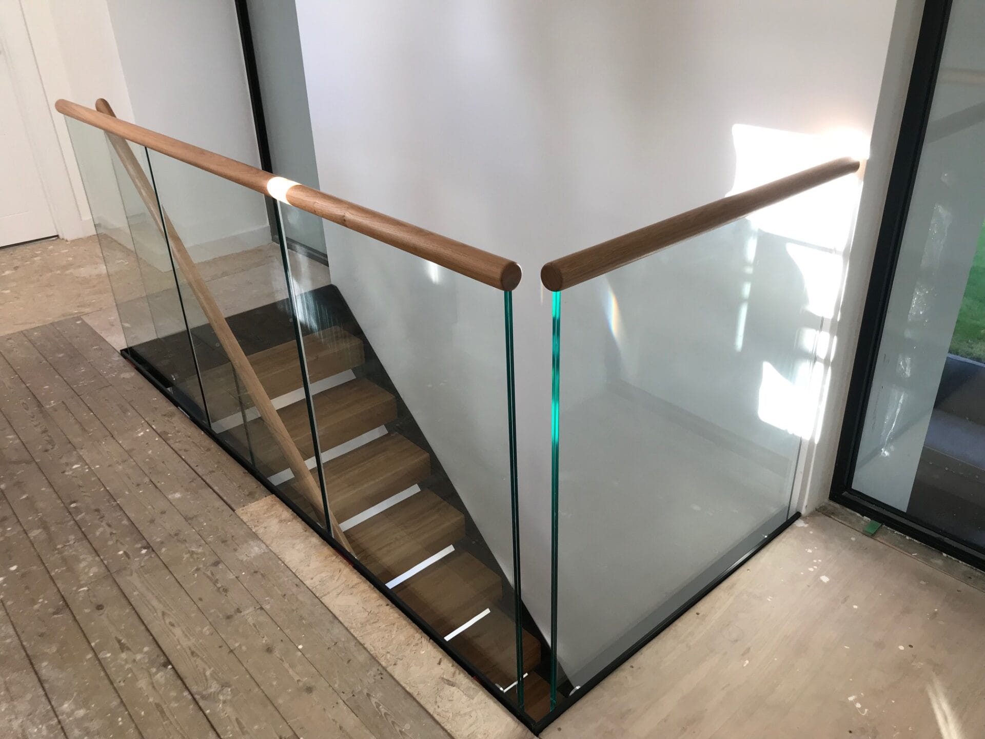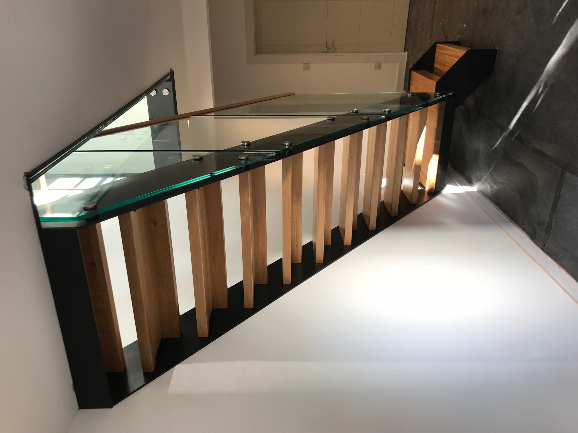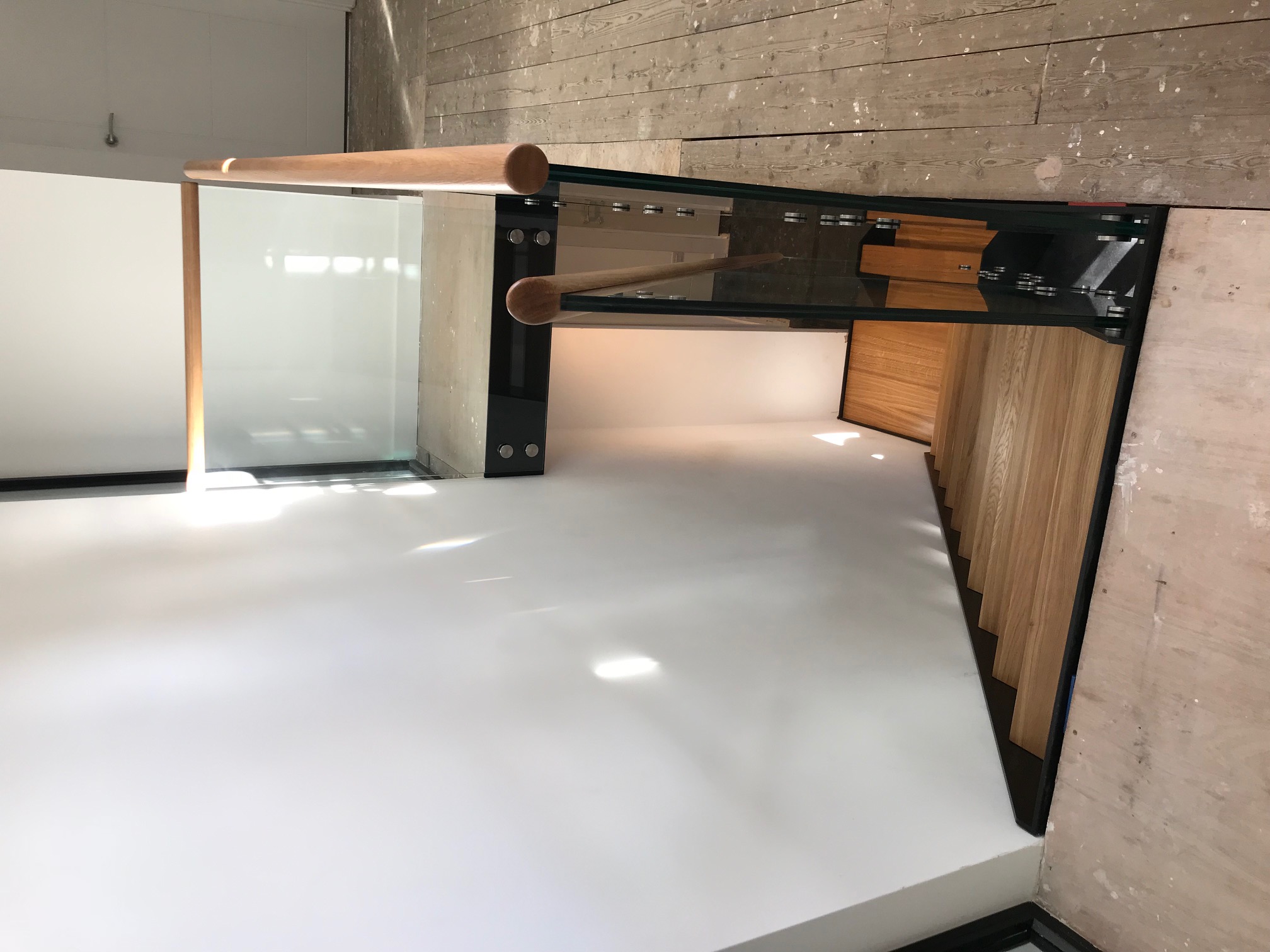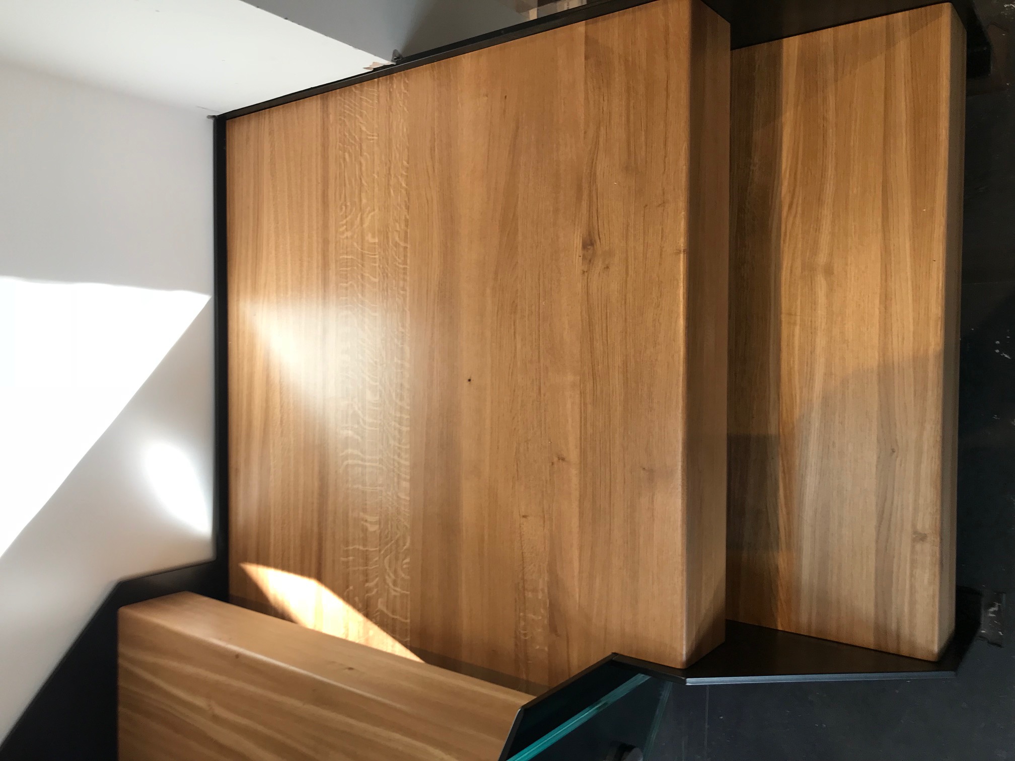 The grain in the oak treads on this staircase turned out absolutely beautifully and became a real feature of the stairs. Anthracite Grey stringers and apron coverings give a superb contrast with the solid oak treads and oak handrail which caps the glass balustrades on both the staircase and the landing. To ensure conformity to the UK Staircase Building Regulations L Shaped Treads were used. A square platform was the preferred choice to provide the perfect access from the ground floor.
