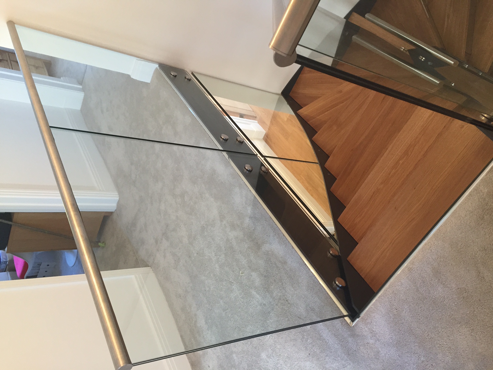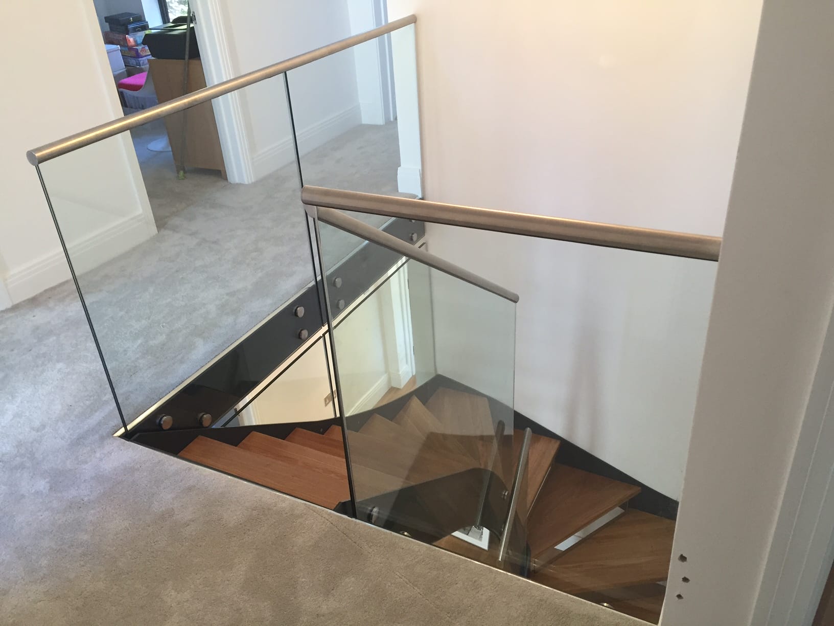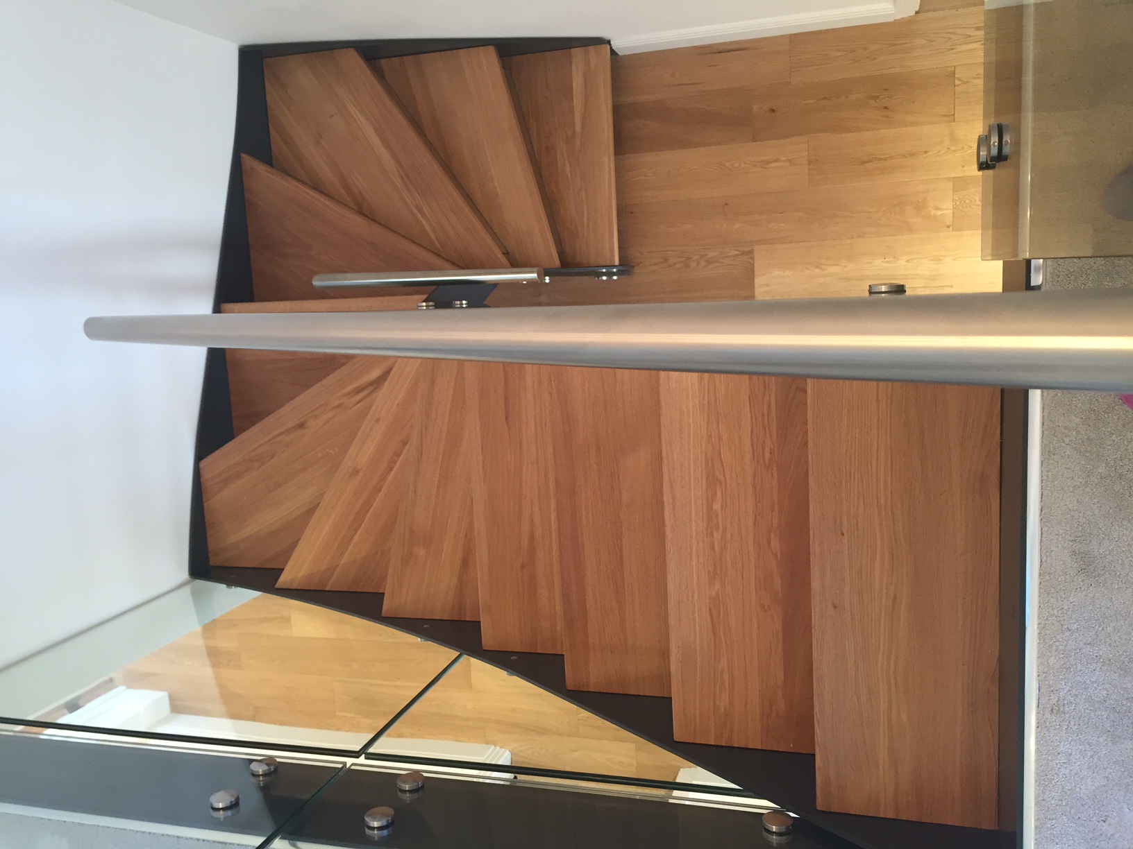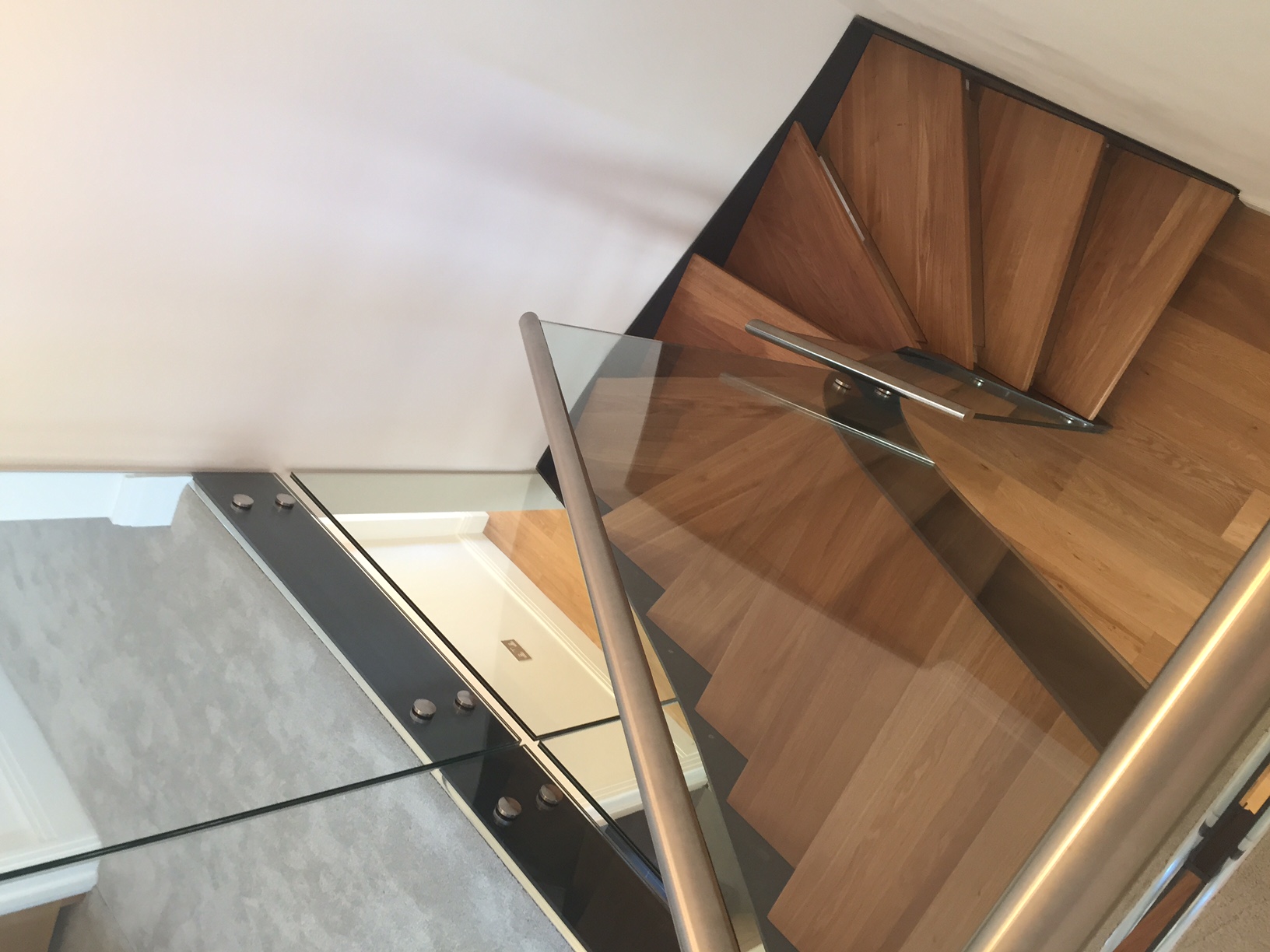 A striking, sculptural effect with the Flight 50 Internal Metal Staircase is achieved using graduated winders. This creates the dramatic curved steel stringers on this staircase, providing an interesting visual aspect and a very comfortable staircase. The solid oak treads have glass risers to conform with UK building regulations for staircases. (requires no gap greater than 100mm)