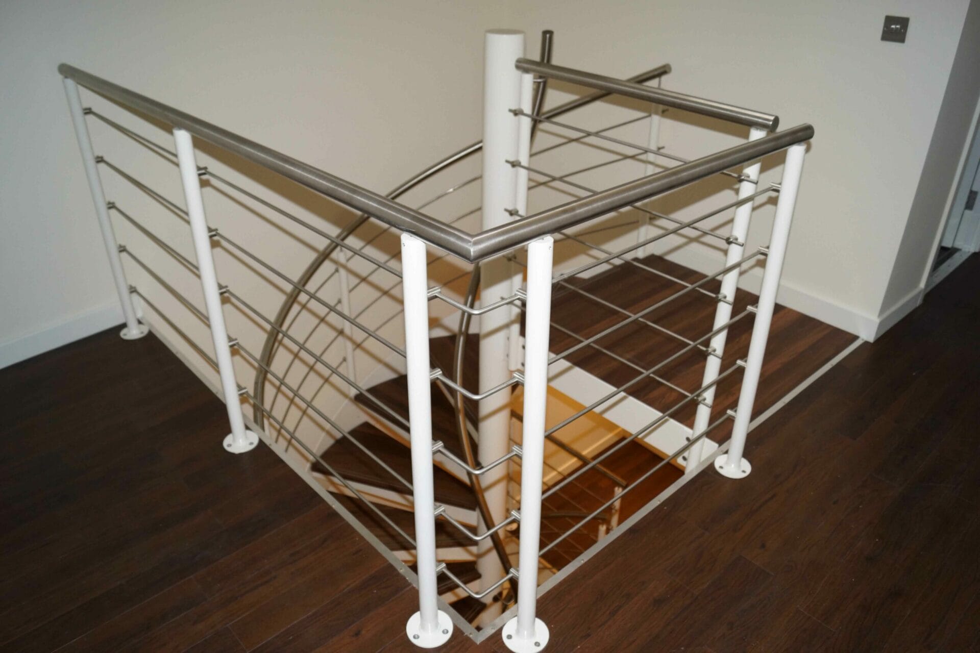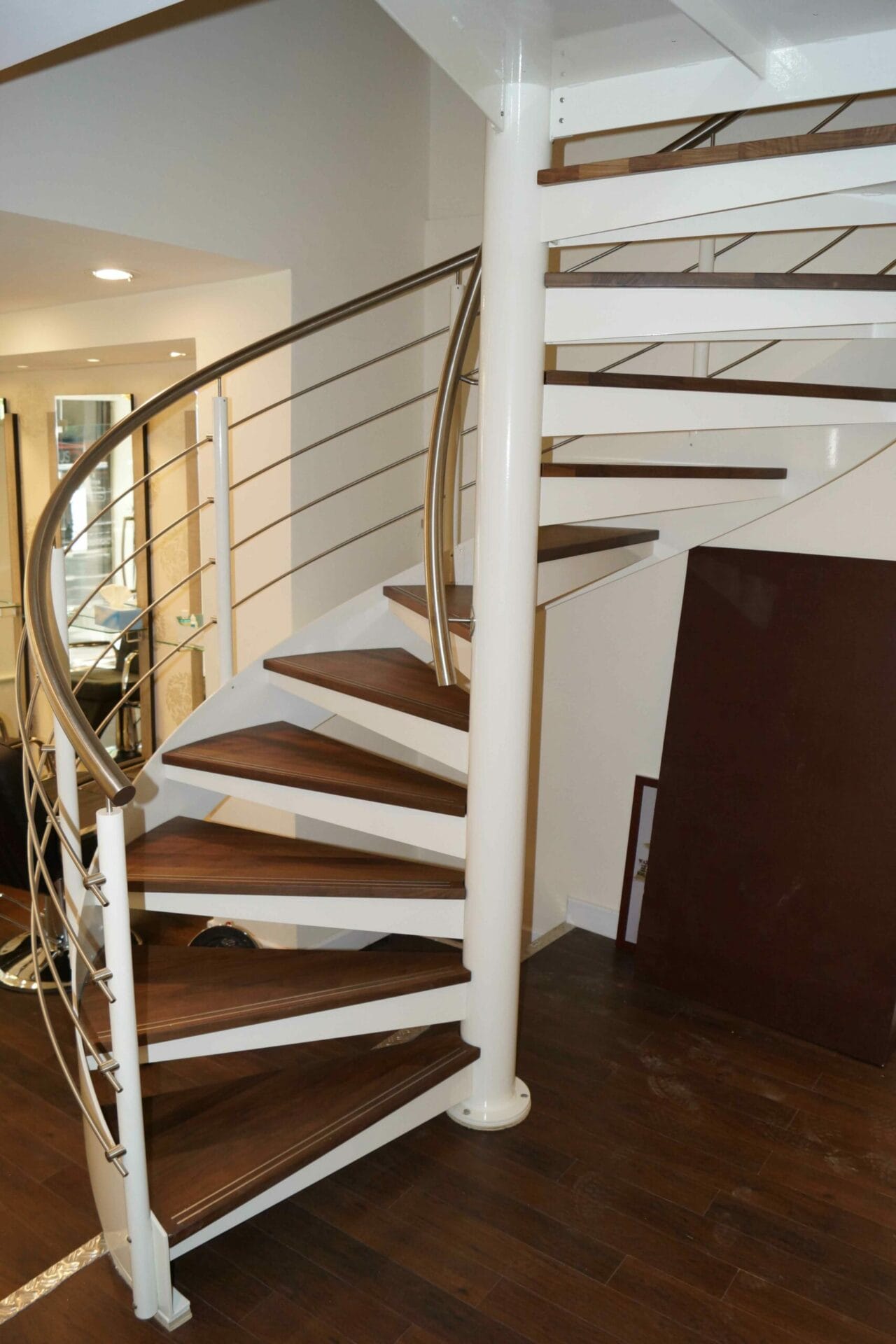 A commercial grade spiral staircase used over three floors in a shop. Walnut treads with inlaid Stainless Steel strips to give grip and for visual highlighting of edge of step.