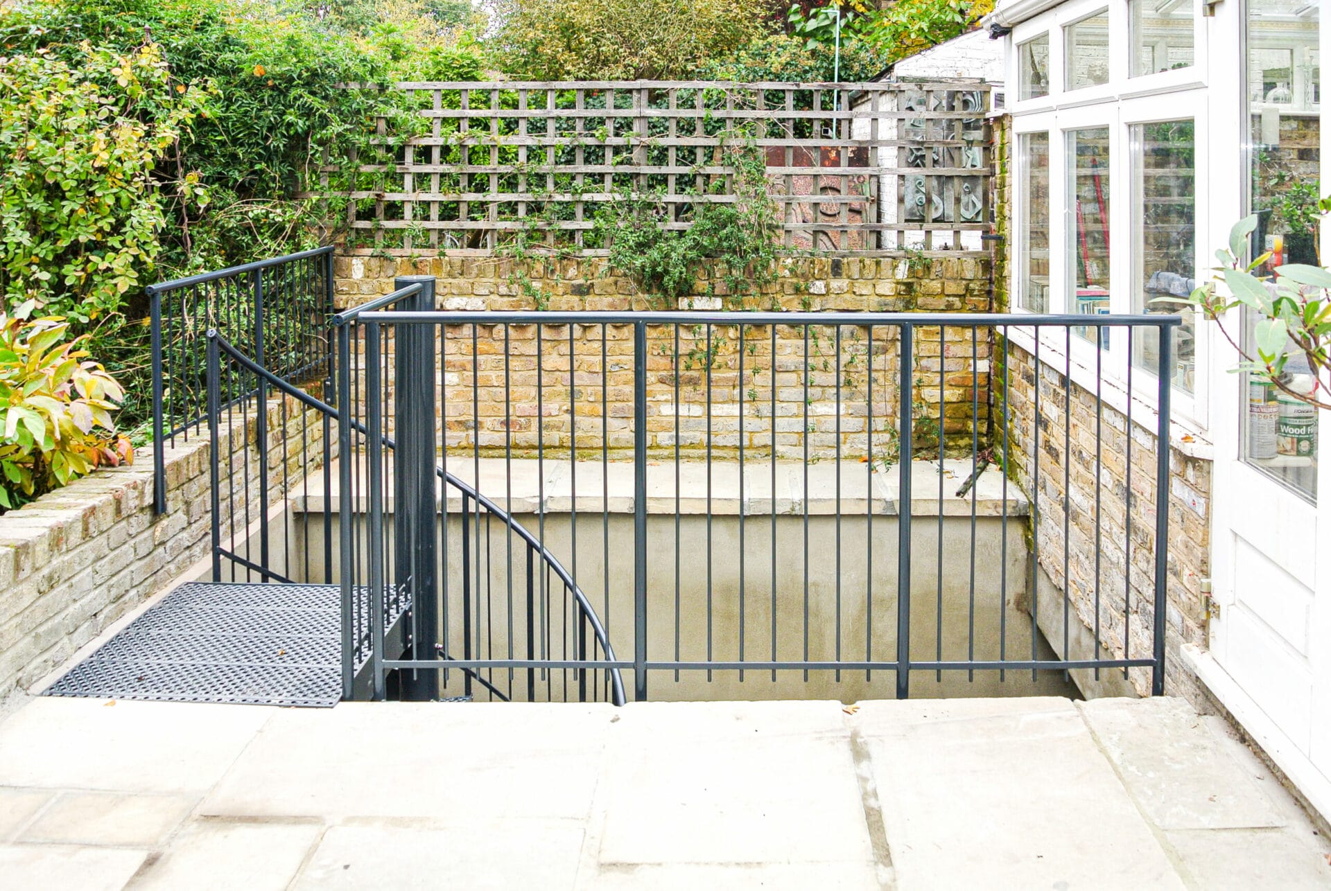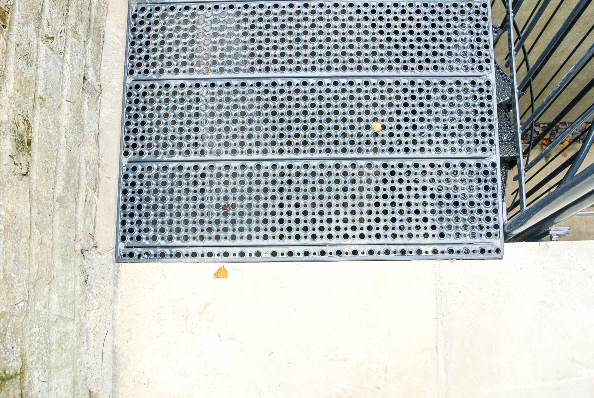 Grated Landing Platform – Prevents water pooling and allows light to filter through, reducing slip risk and adding architectural interest.