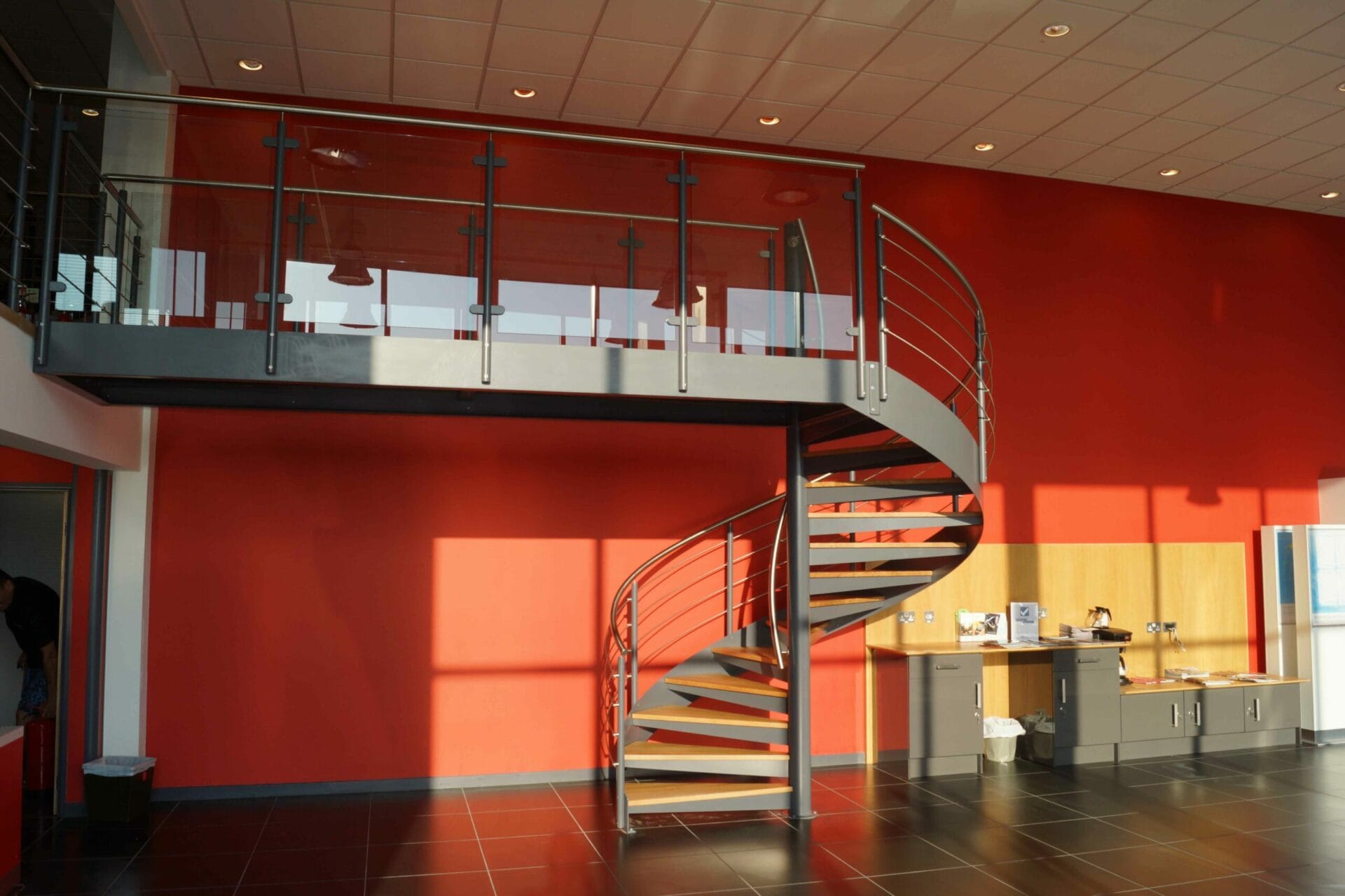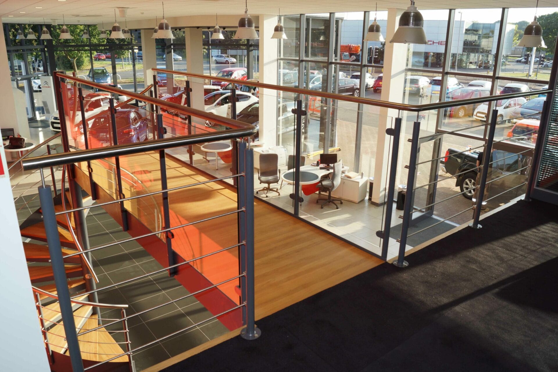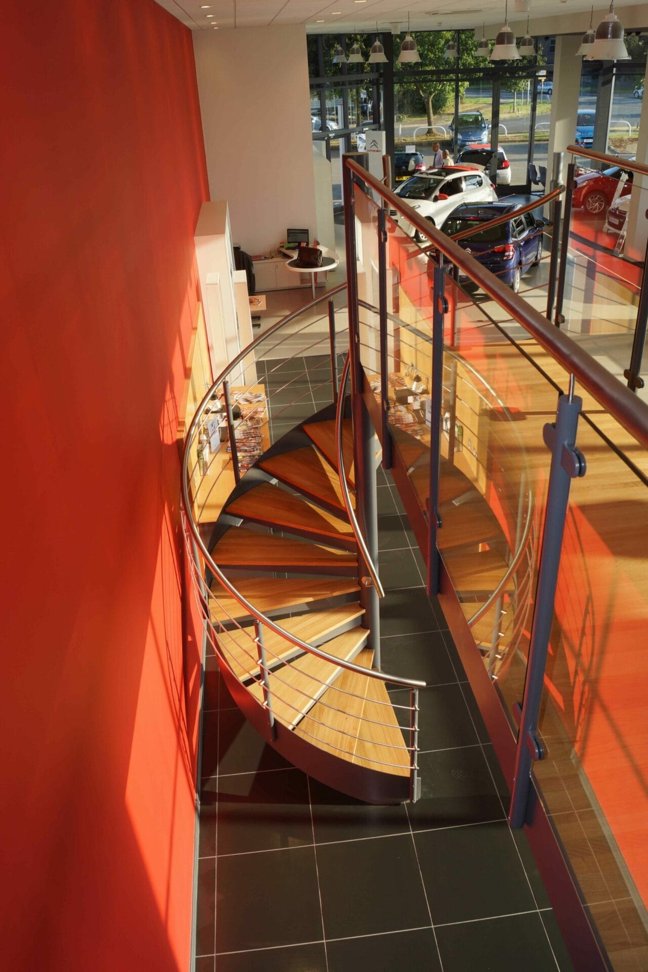 The design brief for this staircase was to create access to a sales and administration area above a car showroom. It was necessary to create something that was visually impressive but also to give safe and comfortable access. A Spiral Staircase with a connecting bridge was just the job.