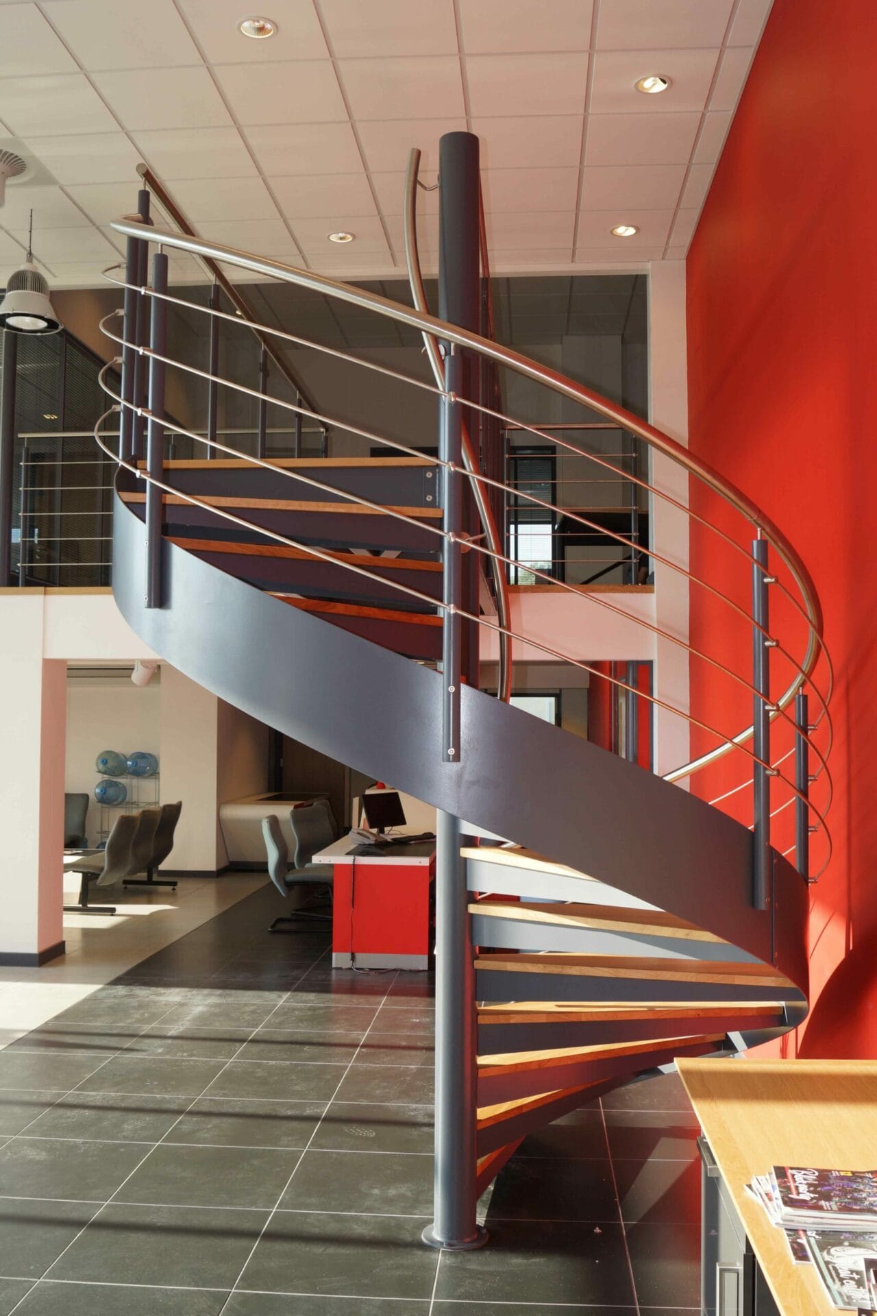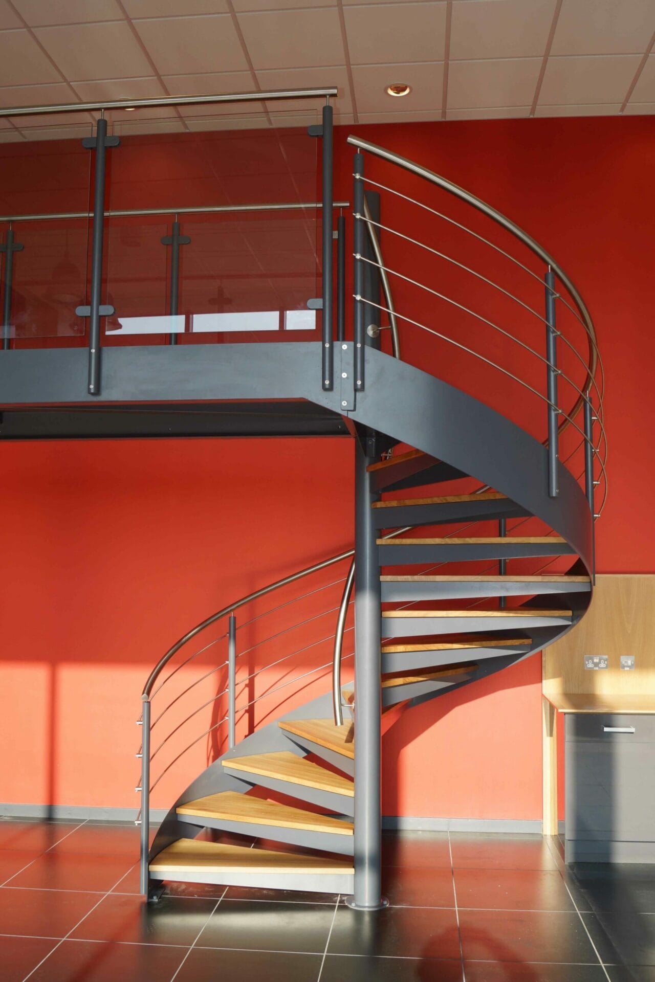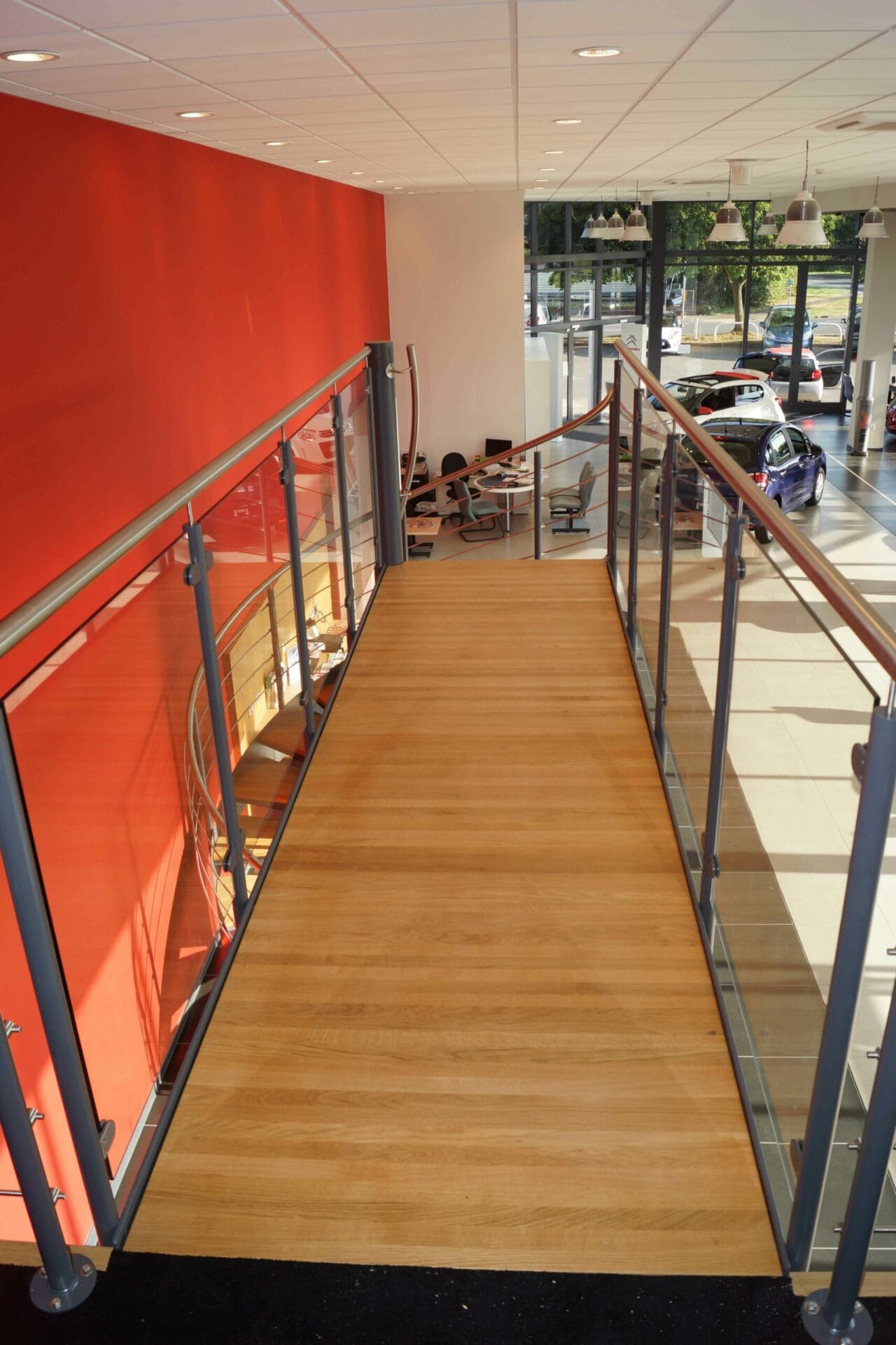 The design brief for this staircase was to create access to a sales and administration area above a car showroom. It was necessary to create something that was visually impressive but also to give safe and comfortable access. A Spiral Staircase with a connecting bridge was just the job.